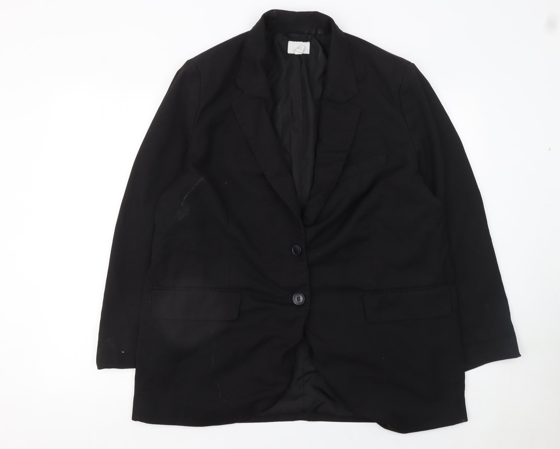 Elevate your professional wardrobe with this timeless black blazer from H&M, designed with a sleek tailoring that effortlessly combines sophistication and comfort. Crafted in a woven blend of polyester, viscose, and a subtle touch of elastane, this women's regular fit jacket offers a flattering silhouette that maintains structure while allowing a comfortable range of movement. The fully lined interior in 100% polyester ensures a smooth fit over your outfit, making it perfect for long days at the office or business meetings. Featuring a classic two-button fastening and stylish notch lapels, this single-breasted blazer is a wardrobe essential that brings refined elegance to any ensemble. The jacket includes two functional front pockets and a structured design ideal for pairing with tailored trousers, pencil skirts, or even jeans for a more relaxed smart-casual appearance. The long sleeves and midweight fabric make this piece versatile across multiple seasons, from spring and autumn layering to winter office wear. Perfect for business, workwear, or formal occasions, this blazer’s simplicity and professional aesthetic make it a must-have staple. While it remains in very good condition with minimal signs of previous wear and a small light mark on one sleeve, its overall presentation is sharp, clean, and ready to wear. A wonderful option for those seeking a reliable and polished black blazer that delivers on both quality and timeless appeal. Whether you’re attending a meeting, interview, or evening event, this piece will ensure you look poised and confident. Designed to transition seamlessly from desk to dinner, this H&M black blazer is an easy styling solution for modern professionals and fashion-conscious individuals alike. Its classic cut and versatile use make it an essential investment piece for any wardrobe looking to balance functionality and timeless style.