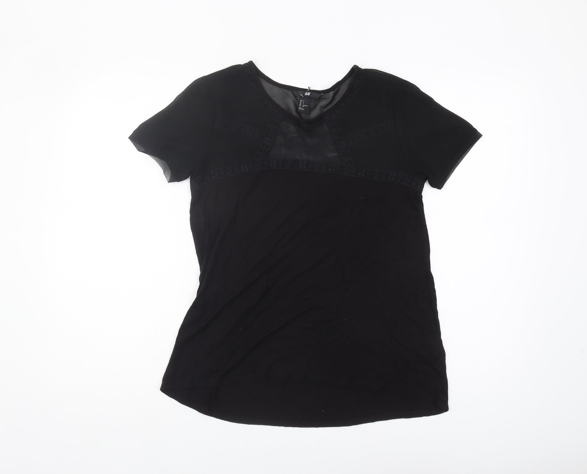 Elevate your everyday wardrobe with this chic and versatile H&M Women's Black Lace Accent Short Sleeve T-Shirt. Crafted in a blend of polyester and viscose, this piece is designed to offer comfort and durability while maintaining its fashionable appeal. The regular fit and round neckline provide a classic silhouette that's easy to style with various outfits. Perfect for casual occasions all year round, this top smoothly complements denim jeans or skirts. The lace accent detail adds a touch of elegance, making this piece stand out in understated sophistication. Whether you're heading out for a casual day with friends or simply relaxing at home, this t-shirt is your go-to choice for effortless style and comfort. Made to be machine washable, it promises easy care and ensures you look fresh on any day. Discover the blend of comfort and style with this signature H&M piece, which can quickly become your wardrobe essential without compromising chic elegance.
