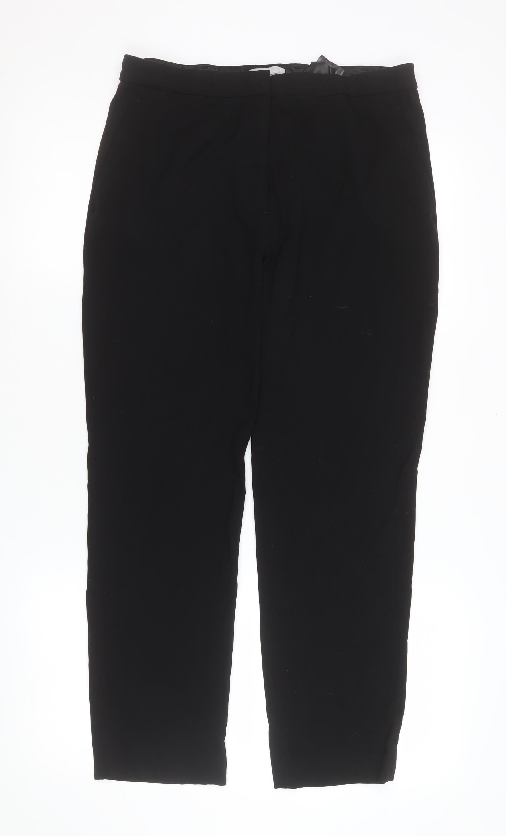 Elevate your everyday and workwear wardrobe with these classic black trousers from H&M, designed to provide a flattering fit and exceptional comfort. Tailored for women, these versatile trousers are cut in a slim, straight leg silhouette that combines timeless style with modern practicality. Crafted from a quality blend of 60% polyester, 35% viscose, and 5% elastane, the fabric offers a smooth finish and a touch of stretch for all-day ease of movement. The material’s twill-like texture ensures a polished and structured look, perfect for office attire or business-casual outfits. Featuring a mid-rise waist with an elastic waistband that enhances comfort without compromising on structure, these trousers achieve a refined fit while maintaining flexibility. The zip closure at the front ensures a seamless, tailored appearance while remaining easy to wear and maintain. Practical design details, such as an easy-care fabric and breathable composition, make these trousers suitable for frequent use throughout the seasons—ideal for autumn, winter, and spring styling.Their clean black colourway pairs effortlessly with shirts, blouses, or knitwear, ensuring endless outfit possibilities for both professional and casual settings. Whether you’re dressing up for a meeting, attending an evening event, or simply upgrading your daily essentials, these H&M trousers deliver sophistication with functionality. Their well-balanced cut and fabric composition make them universally flattering, providing structure while allowing natural ease of movement.In excellent pre-owned condition with only light signs of wear and no visible damage, they remain a dependable addition to any versatile wardrobe. Suitable for a UK size 10, they maintain a sleek profile that complements various body types. Easy to care for and machine washable, these trousers are a practical wardrobe staple built to last through multiple wears and wash cycles.Refined, comfortable, and endlessly wearable, these H&M women’s black trousers are the perfect choice for anyone seeking style, comfort, and adaptability in one sophisticated piece. Ideal for business, casual, and workwear occasions alike, they bring understated elegance to every outfit.