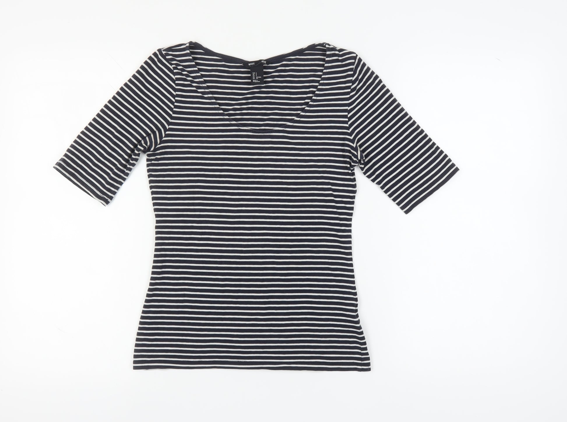 Discover casual comfort with this H&M Basic Women's T-Shirt in a versatile black striped pattern. Perfectly tailored for a regular fit, this stylish piece is crafted in a soft cotton and elastane blend, ensuring stretch and mobility for your everyday wear. The 3/4 sleeve length offers a chic touch, ideal for any season, making it a must-have addition to your wardrobe.Designed to seamlessly fit into your casual outings, this scoop neck basic t-shirt exudes understated elegance and can be easily paired with jeans or skirts. Its machine washable fabric offers easy care, making it an excellent choice for those who value both style and convenience. Suitable for a variety of occasions from lounging at home to a casual day out, its timeless design ensures it stays in style season after season.Embrace the blend of simplicity and fashion-forward design that H&M is known for. Whether you're heading to a casual gathering or making it a part of your daily attire, this piece provides comfort and style. Embrace the versatility this top brings, with its chic black and white striped pattern that allows you to mix and match effortlessly. Invest in a piece that offers both quality and a fashionable edge, sure to become a staple in your clothing collection.