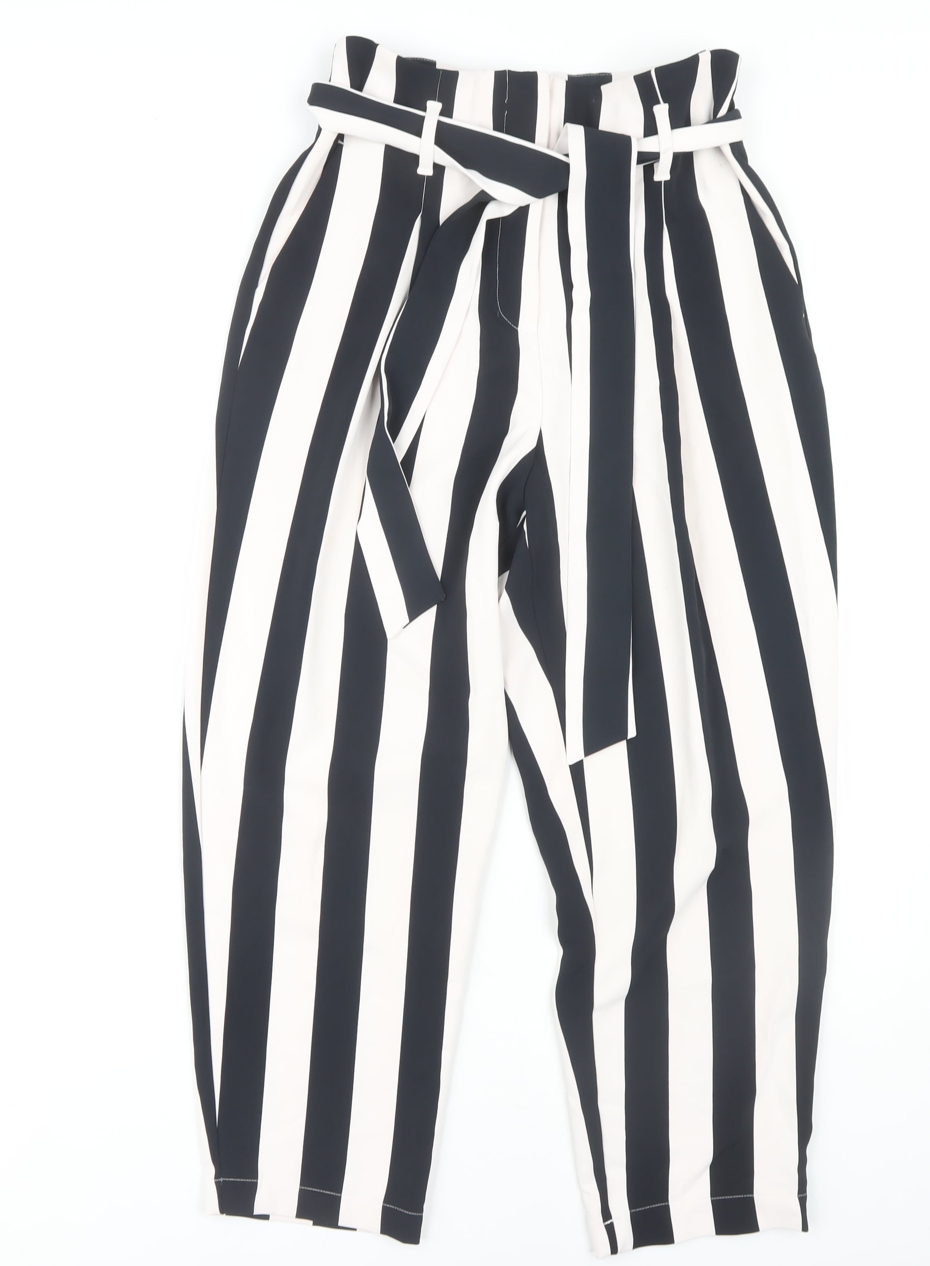 Step out in style with these chic H&M women's trousers, beautifully designed for both casual and semi-formal occasions. These black and white striped paperbag trousers are crafted to provide comfort and elegance in every stride. Sized at UK 10, they cater to those looking for fashion-forward pieces that blend versatility with a modern edge. Made from a high-quality blend of 96% polyester and 4% elastane, these trousers offer a slight stretch for optimal comfort, ensuring that you remain at ease throughout the day. The paperbag style, coupled with a fashionable belted feature, accentuates the waist for a flattering silhouette. Pair them with a fitted top and your favourite heels for a look that exudes confidence and chic sophistication.Perfect for casual outings, these trousers offer a stylish option for brunch, shopping trips, or relaxed work attire. Their machine-washable fabric ensures convenient care, making them a practical addition to any wardrobe. Despite lacking original sales tags, these trousers are in excellent condition, showcasing no signs of use. Transform your look with these timeless black striped trousers—a must-have fashion piece that offers endless styling possibilities. Whether you're dressing up or down, these trousers promise to deliver an effortlessly stylish ensemble.
