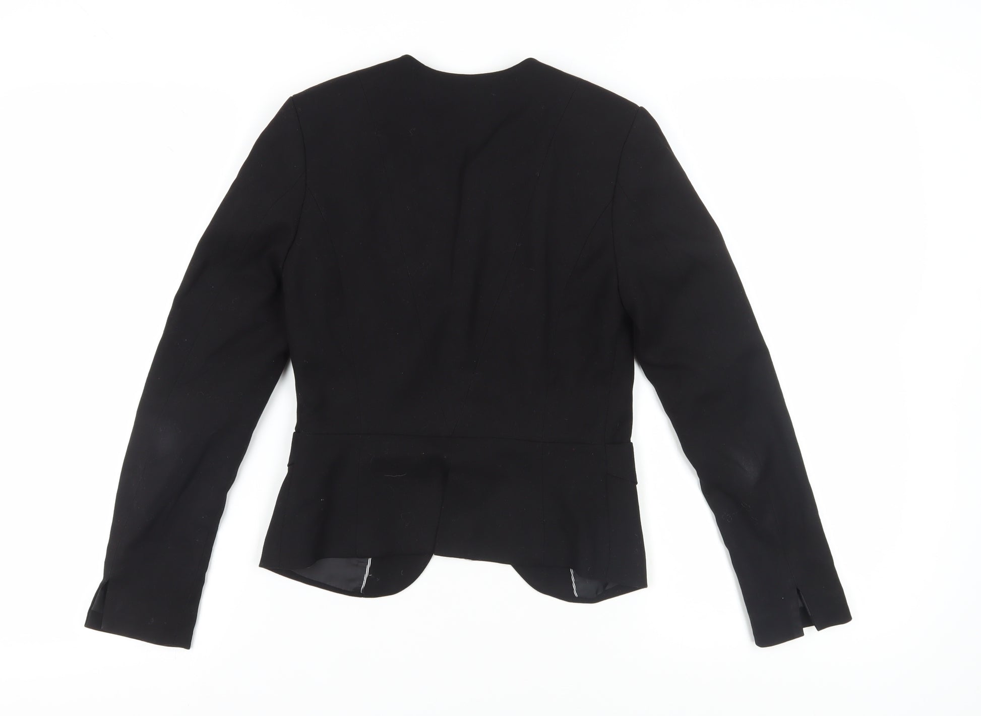 Elevate your professional wardrobe with this chic H&M women's black suit jacket. Designed in a timeless, minimalist style, this jacket offers a tailored fit that enhances your silhouette, making it perfect for business, workwear, or formal events. Crafted from a comfortable blend of polyester, viscose, and elastane, it provides a smooth finish and natural stretch, ensuring all-day comfort and ease of movement. The jacket features a single-breasted cut with no buttons, adding to its streamlined look. Whether worn over a blouse or a light dress, this versatile piece is ideal for all seasons, including spring, autumn, and winter. It is fully lined with polyester, ensuring a polished interior suitable for any occasion. Sized as a UK 4 (equivalent to a EUR 32), the jacket fits a regular body type and includes long sleeves, a notch lapel, and a regular jacket length. Stay smart and stylish with this classic wardrobe staple from H&M, priced affordably to suit your budget. Perfectly suited for women seeking a sleek and contemporary look, this jacket is in excellent condition with minor wear. Don't miss the opportunity to add this essential piece to your collection.