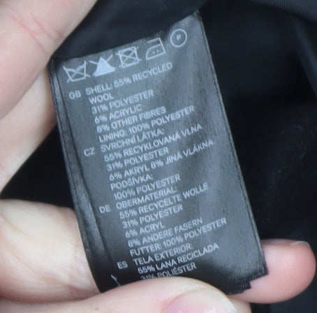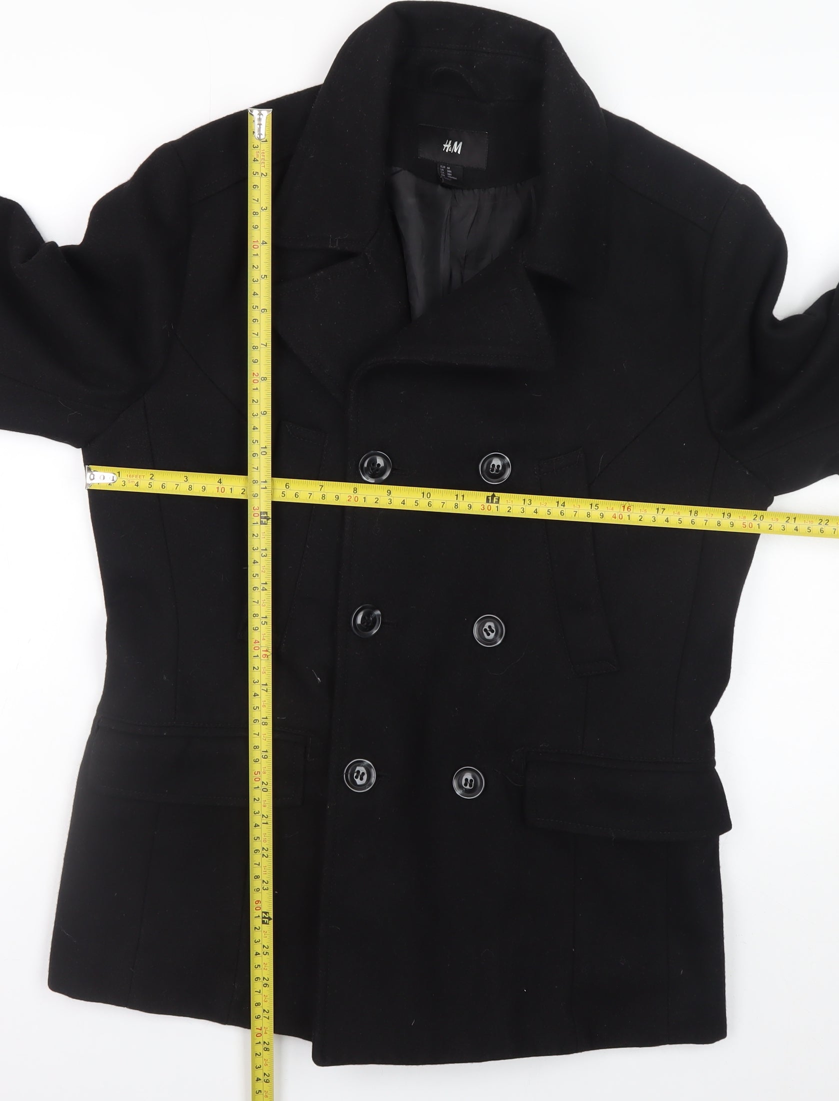 Add timeless charm to your wardrobe with this elegant H&M Women’s Black Wool Pea Coat. Crafted from a warm and durable blend of 55% wool, 31% polyester, 8% acrylic, and 6% other fibres, this coat effortlessly combines comfort and classic style. The soft polyester lining ensures comfortable wear throughout the colder months, while its structured silhouette provides a flattering and polished appearance. Featuring traditional double-breasted button fastening, wide lapel collar, and practical front pockets, this short-length coat delivers both practicality and sophistication. Perfect for layering over both formal and casual outfits, it transitions seamlessly from business meetings to weekend outings. The black colour adds versatility, making it easy to pair with everything from tailored trousers to dresses and boots. Designed for the autumn and winter seasons, this coat offers just the right balance of warmth and breathability for unpredictable weather. The fabric’s fine wool texture gives a luxurious hand-feel, while the structured seams enhance its tailored shape. Despite light linting and minor surface wear, the coat remains in very good condition with plenty of wear left. Ideal for someone seeking a refined yet practical outerwear piece, this pea coat captures a timeless aesthetic that never goes out of style. Whether you're dressing up for a professional ensemble or adding a touch of classic sophistication to your casual look, this beautifully constructed coat from H&M delivers an effortlessly polished finish every time.