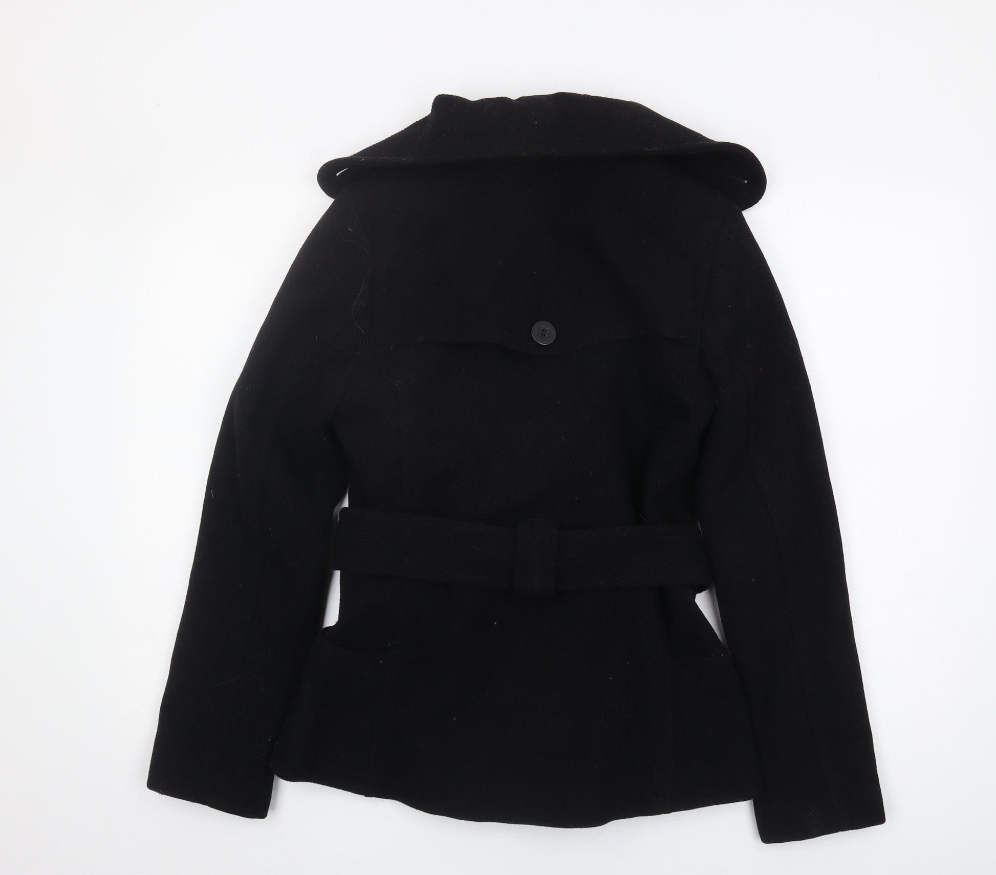 Step out in style with this elegant H&M women's pea coat, perfect for the colder months. Crafted from a luxurious blend of 70% wool and 30% nylon, this coat combines warmth with sophisticated style. Its deep black hue adds a touch of classic elegance, making it a versatile addition to any wardrobe.Designed for comfort and functionality, this coat features a belted waist that flatters your silhouette, while the fully lined interior ensures superior comfort. The double-breasted front with button accents provides a polished look, while the long sleeves offer extra coverage against the chill.Perfect for autumn and winter, this short-length coat pairs effortlessly with both casual and more formal outfits, making it an excellent choice for varied occasions. Whether you're heading to work or out for a casual gathering, this coat adds a layer of style and sophistication to your ensemble.In excellent pre-owned condition with no visible defects, this coat is primed to offer stylish warmth for many seasons to come. Don't miss out on making this timeless piece a staple in your collection.