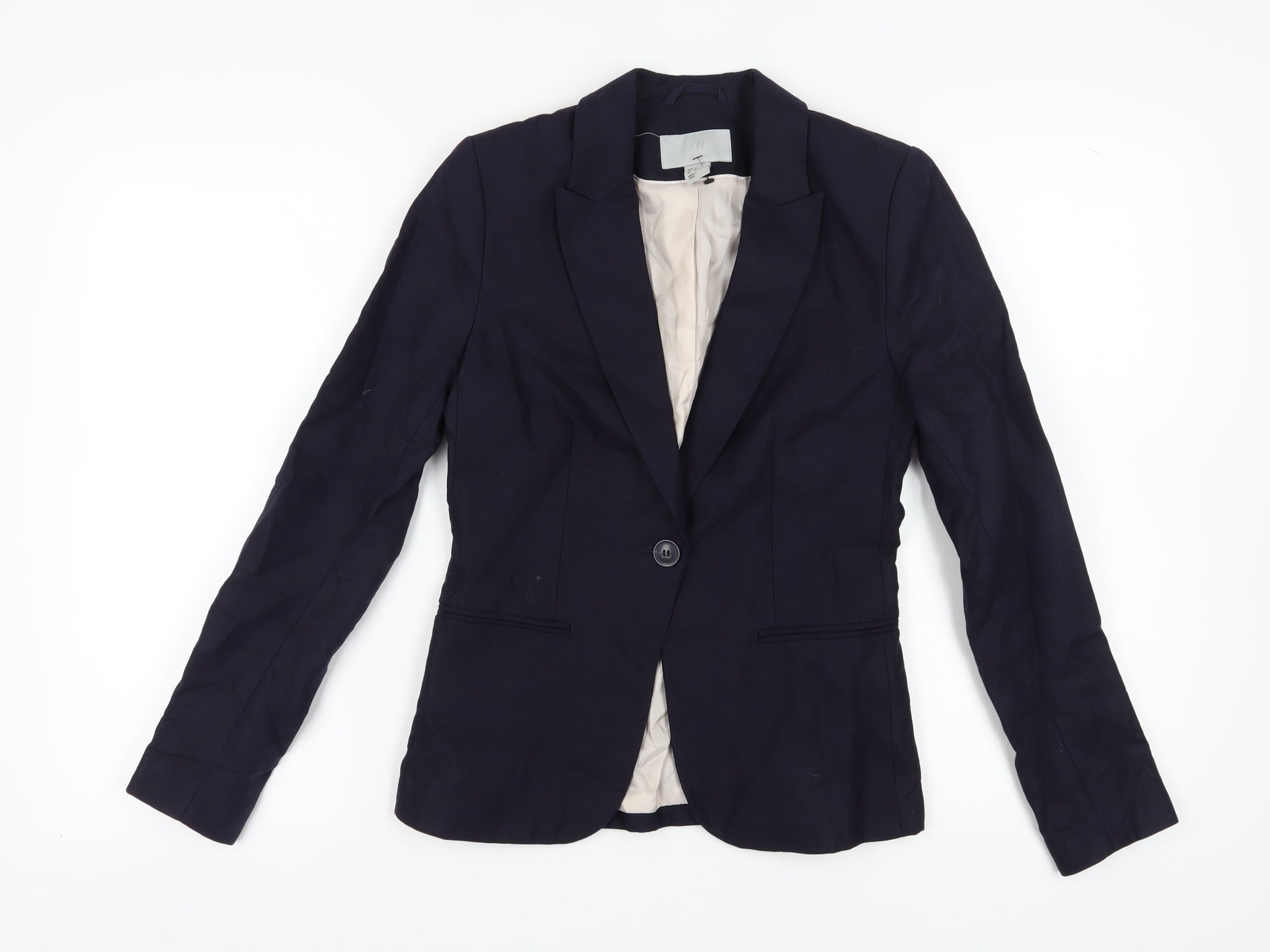 Enhance your wardrobe with this versatile H&M women's blazer, perfectly suited for both casual and business occasions. Designed in a calming blue hue, this regular-fit blazer ensures a timeless appeal. Crafted from a breathable cotton and linen blend, it offers outstanding comfort and style. The blazer features a classic single-breasted cut with a two-button front and notch lapels, ideal for adding sophistication to any outfit. The lining, made from a polyester and viscose mix, offers an added layer of comfort and support. This piece is in excellent condition, showing only slight wear with no original tags. Perfect for spring and summer seasons, this blazer can seamlessly transition from day to night. Whether dressing up for a meeting or down for a casual outing, this blazer is a must-have for anyone seeking a mix of style, comfort, and practicality. Its machine-washable fabric makes it an easy-care addition to your collection. Elevate your look with this chic and functional outerwear piece today.