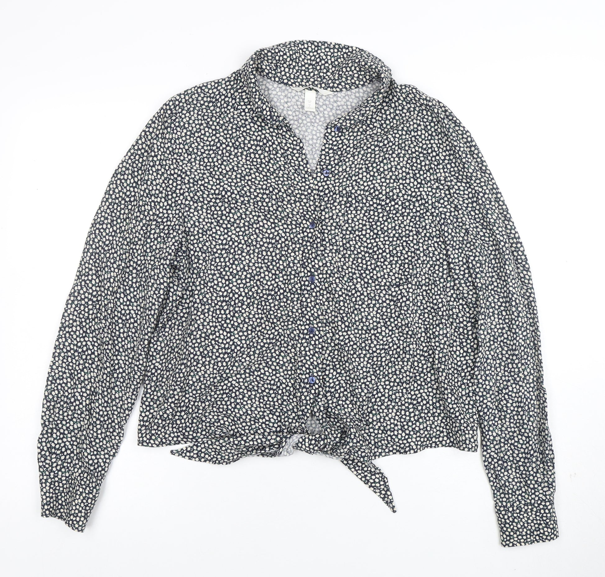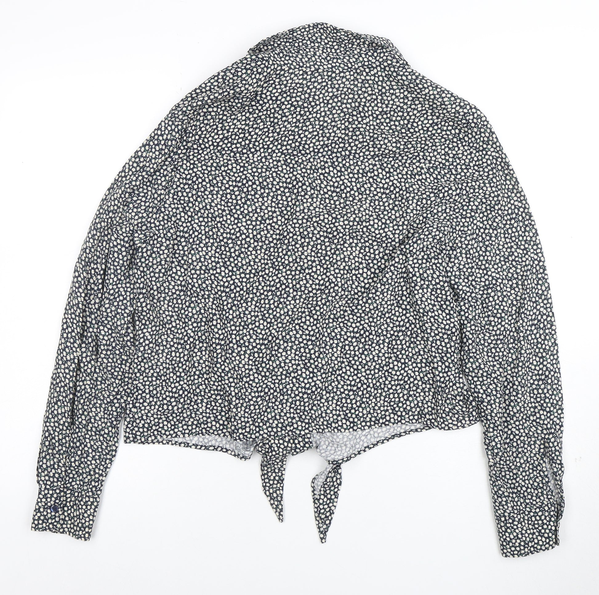 This H&M women's blue floral blouse is a charming and stylish piece perfect for any casual or semi-casual occasion. Crafted from soft, breathable 100% viscose, it offers a lightweight and comfortable feel, ideal for layering or wearing on its own during spring and summer. The delicate white flower pattern against a navy blue background gives it a fresh, feminine touch that never goes out of style. The blouse features a collared neckline and a full button-up front, adding a hint of classic tailoring, while the cropped silhouette and tie-front hem bring a modern, relaxed edge. Long, fitted sleeves with button cuffs complete the look, making it versatile enough for both workwear and weekend wear. Whether paired with high-waisted jeans, tailored trousers, or a skirt, this blouse offers ample styling options. The viscose fabric provides a beautiful drape and easy-care convenience as it is machine washable. Given its excellent condition with minimal signs of use, it is a sustainable and affordable way to refresh your wardrobe. Perfectly suited for a variety of settings—be it a casual lunch date, a stroll in the park, or a day at the office—this floral tie-front button-up is an easy favourite that combines comfort, femininity, and effortless chic. Ideal for the modern woman who values both style and comfort, this blouse embodies versatile elegance. Don't miss the opportunity to add this lightweight and flattering piece to your collection. Its relaxed yet polished design ensures it will quickly become a go-to in your rotation.