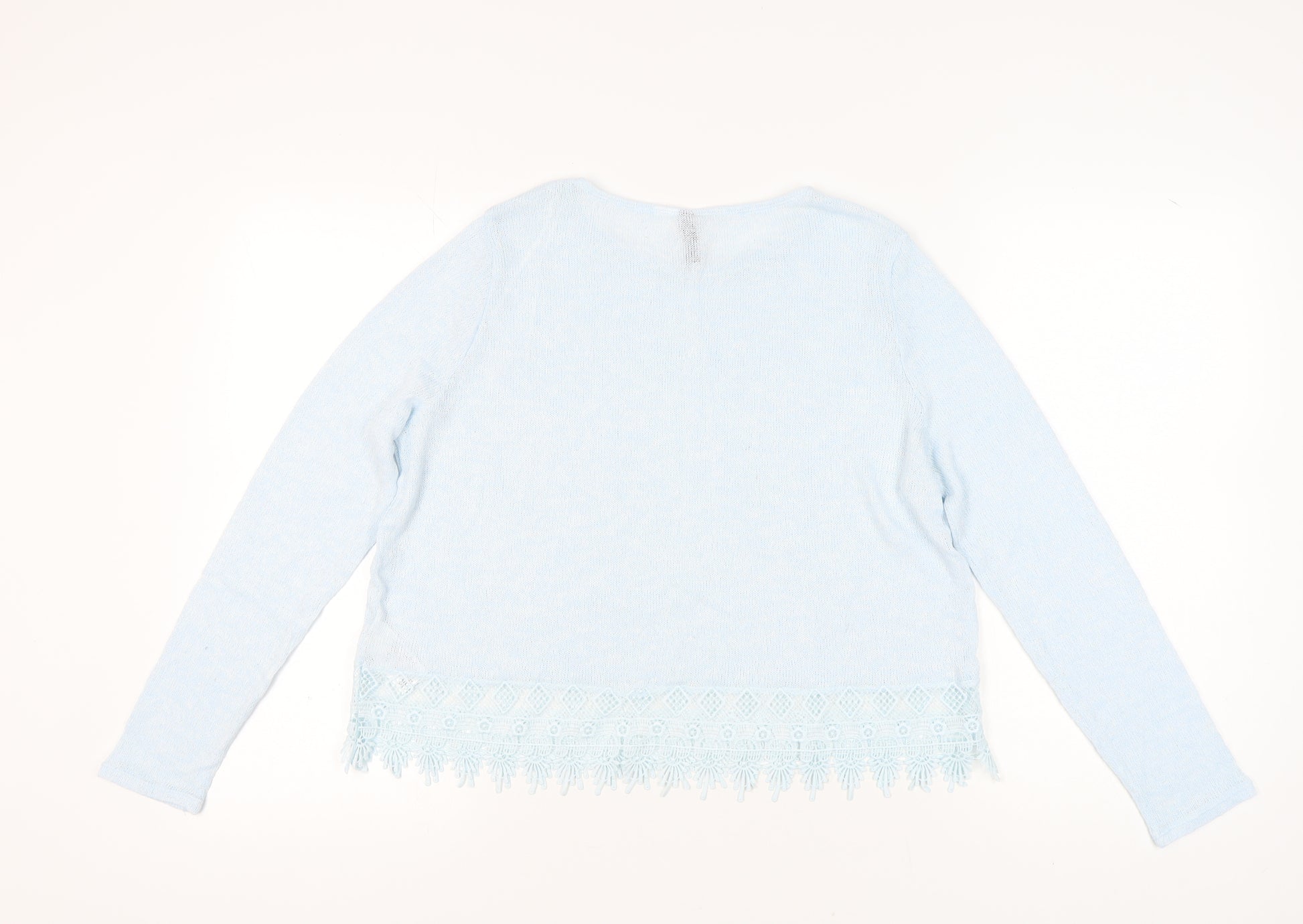 Elevate your wardrobe with this stylish H&M Women's Blue Knit Jumper, perfect for adding a touch of elegance to your casual attire. Designed in a beautiful blue with a crochet accent, this jumper offers an understated sophistication that’s ideal for any spring or summer occasion. The jumper features a comfortable round neckline and long sleeves, making it both chic and functional for layering or wearing on its own. Crafted from a soft blend of materials, including polyester, viscose, and elastane, this jumper provides a cozy fit with a subtle stretch to enhance your comfort and ease of movement. Its lightweight knit fabric ensures breathability, making it a versatile piece for all-day wear. The jumper's Regular size type and machine washable care allow for easy maintenance, letting you enjoy more wears with less hassle. Embrace casual elegance effortlessly whether you're heading to a casual day out or simply enjoying a cozy day at home. Its simple yet stylish design fits seamlessly into any wardrobe, allowing for versatile styling options. Wear it with your favourite jeans for a classic look or pair with a skirt to dress it up. Grab this excellent-condition jumper, which boasts no visible defects, and inject some style and quality into your everyday outfits at an appealing price.