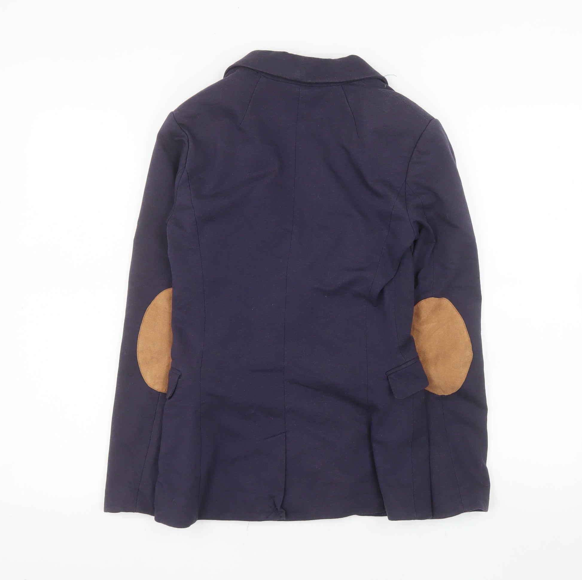 Elevate your wardrobe with this classic H&M women's blazer in a refined navy blue shade. Tailored for a flattering slim fit, this versatile blazer combines professional polish with everyday comfort. Made from a quality blend of cotton, polyester, and elastane, it offers just the right amount of stretch for ease of movement, ensuring a sleek silhouette that maintains its shape throughout the day. The jacket features a single-breasted design with two front buttons, subtle notch lapels, and twin front flap pockets that add both style and practicality. A striped polyester lining enhances comfort and durability, while the tan suede elbow patches at the back provide a touch of contemporary flair and sophistication. Perfect for business meetings, workwear or smart casual occasions, this blazer works beautifully paired with fitted trousers, skirts, or jeans for versatile styling options. Its machine washable convenience means easy care, and the durable fibres ensure longevity. Ideal for Spring and Autumn seasons, this piece transitions seamlessly from day to evening. Despite light natural creasing from storage and gentle previous wear, the blazer remains in very good condition with no visible flaws or stains. Its timeless cut and tailored fit make it a wardrobe essential for modern women seeking effortless elegance. Add this H&M blue slim fit blazer to your collection for a polished and versatile layering piece that complements any professional or casual-chic outfit combination.