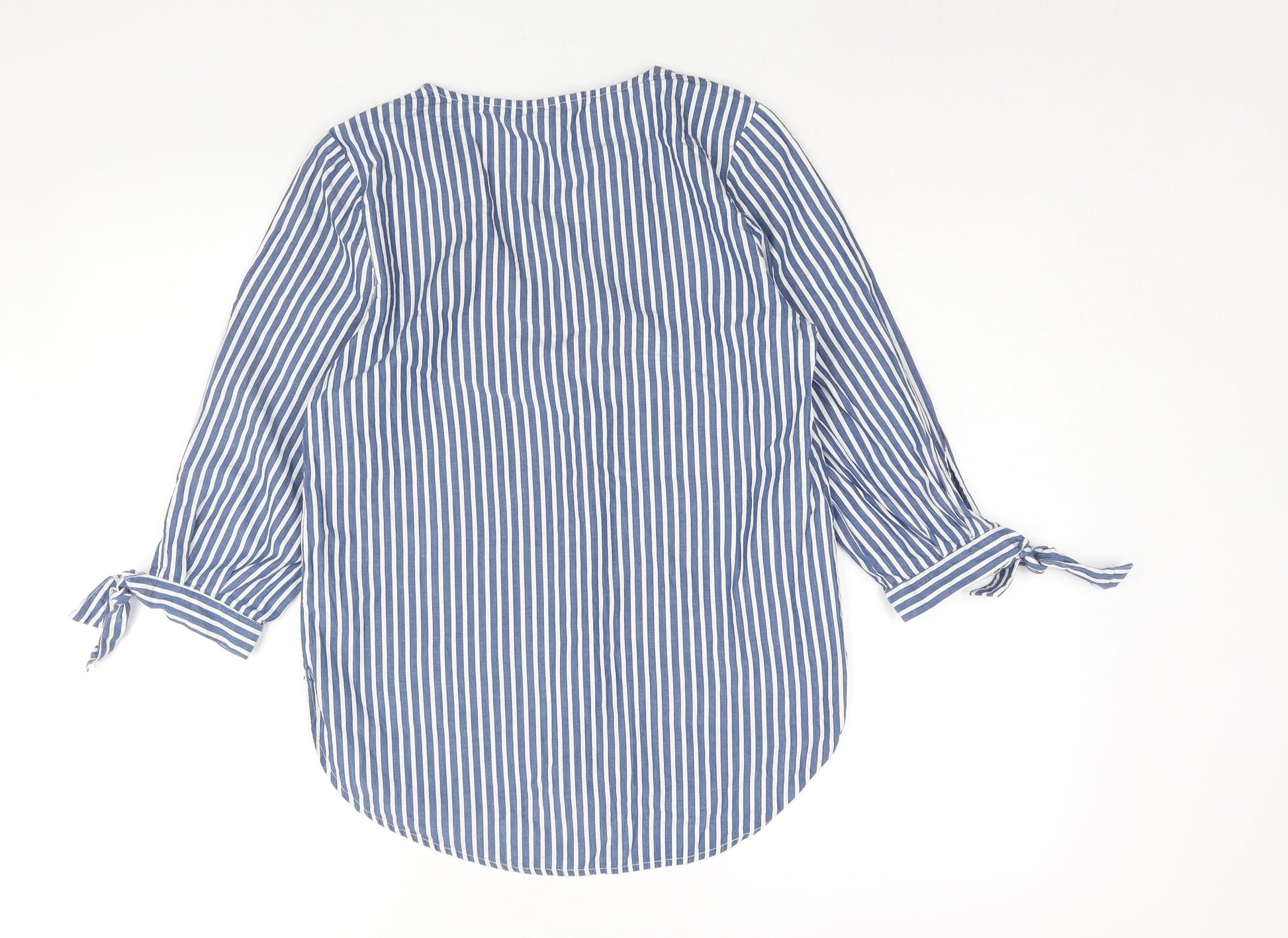Womens Blue Striped Cotton Basic Blouse Size 6 V-Neck - Tie Detail