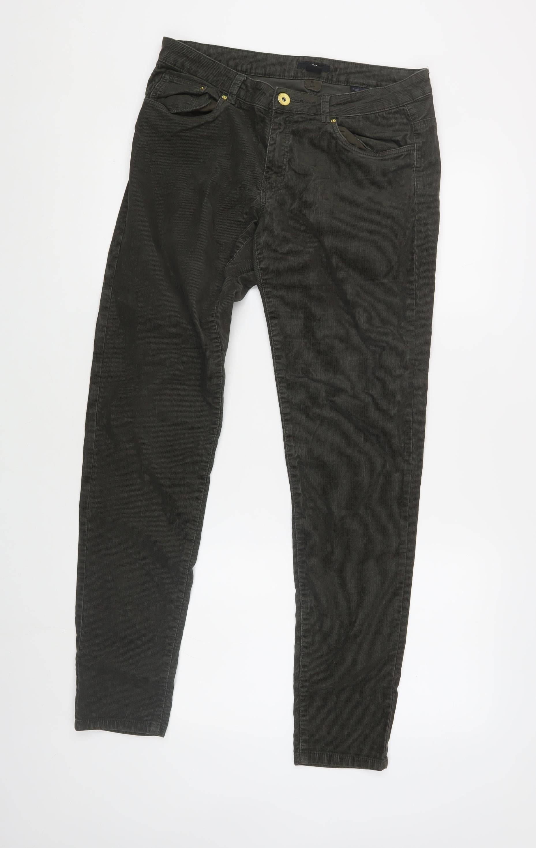 Discover style and comfort with these H&M slim-fit corduroy jeans. Crafted from a durable cotton and elastane blend, these green jeans offer a flattering slim fit perfect for any casual occasion. Featuring a classic 5-pocket design and a secure button and zip closure, they provide both functionality and style. These jeans exhibit slight wear but remain in excellent condition. Machine washable for easy care, they are ideal for the fashion-conscious individual seeking a versatile addition to their wardrobe. Don't miss the opportunity to own these fashionable essentials.