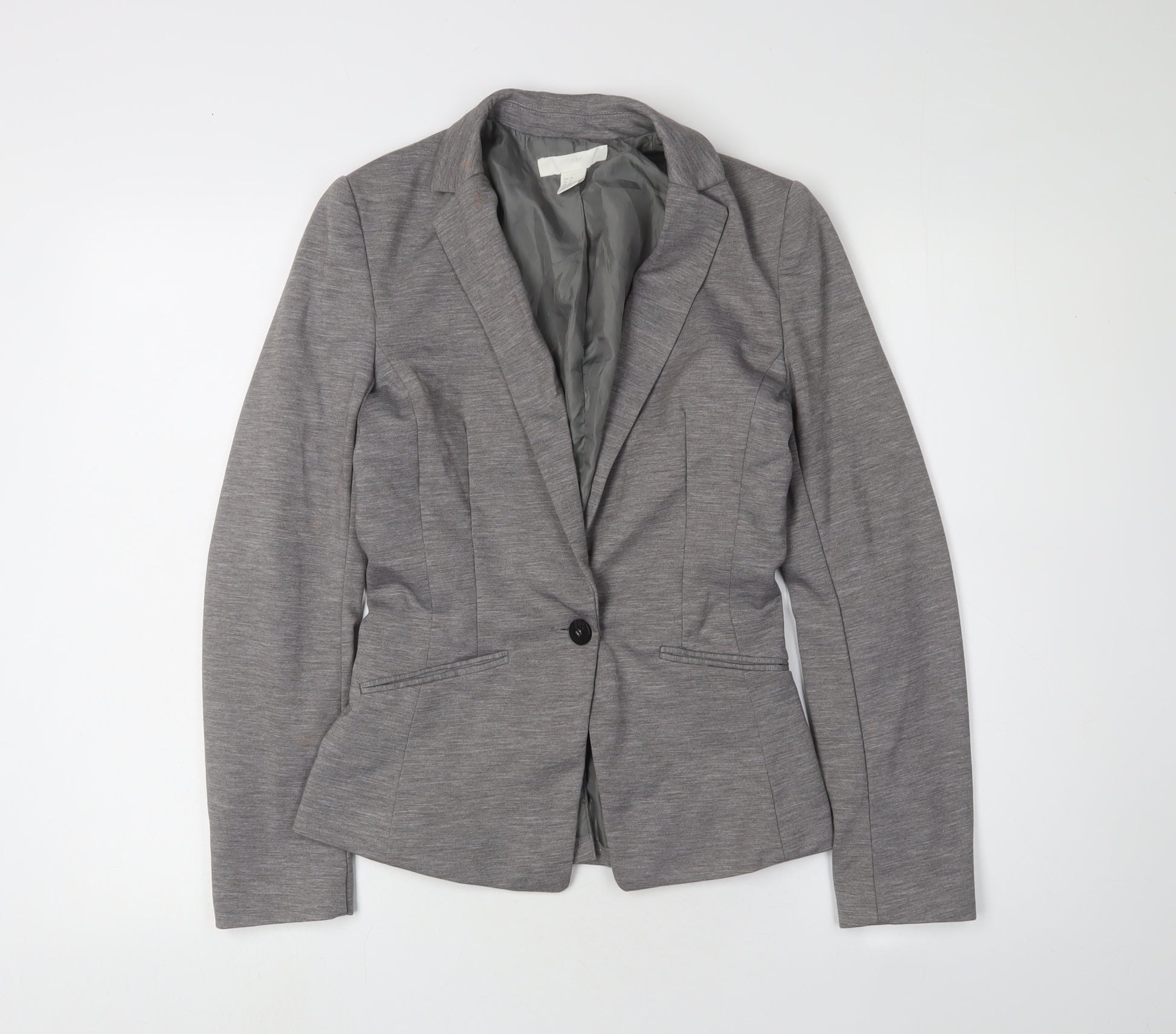 Elevate your wardrobe with this elegant H&M Women's Grey Blazer, perfect for both business and casual settings. Crafted from a high-quality blend of polyester, viscose, and elastane, this blazer offers a comfortable yet sophisticated fit. The regular length and single-breasted cut, combined with a notch lapel and long sleeves, create a timeless silhouette that flatters any shape. This versatile piece is designed with a lined interior for added comfort and a one-button front closure that lends a sleek appearance. Ideal for spring and autumn wear, its neutral grey colour complements any outfit, making it a must-have addition to your suit separates collection. Whether you're heading to the office or a casual dinner, this blazer ensures you look polished and professional. Machine washable for easy care, it's an excellent choice for the modern woman who values style and functionality. With its brand new condition and stylish appeal, this blazer is priced competitively, offering outstanding value. Enhance your ensemble and boost your confidence with this versatile blazer.