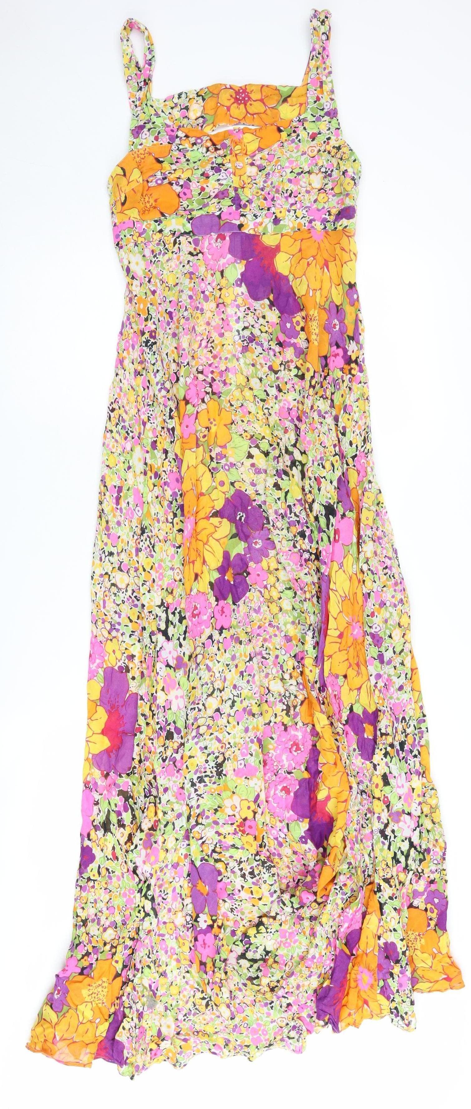 Step into summer with this vibrant H&M women's dress, perfect to bring a splash of colour to any occasion. This sleeveless, multicoloured floral dress is tailored to size 6, offering a sleek fit with its convenient zip closure. With its bright floral pattern and eye-catching hues, this dress seamlessly blends style and comfort, making it an excellent choice for daytime outings or casual gatherings. The strappy sleeve design adds an airy feel, perfect for staying cool. Although pre-loved, it remains in excellent condition, showing no signs of wear. Add a touch of whimsy to your wardrobe with this standout piece and enjoy the freedom of expression it brings to your ensemble.