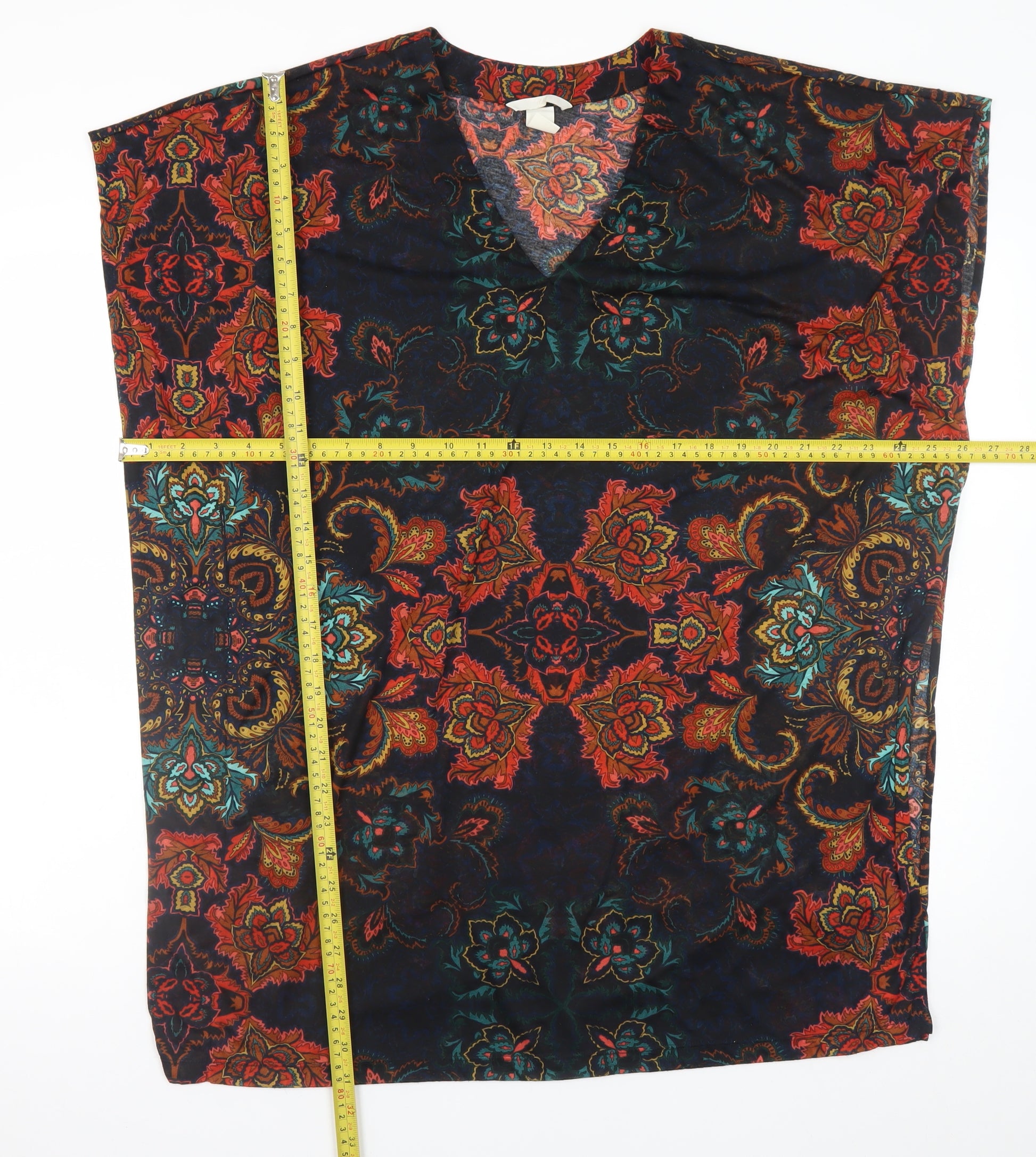 Add a touch of effortless bohemian charm to your wardrobe with this beautifully patterned H&M women’s blouse. Designed in a relaxed tunic style, this sleeveless top features a striking multicoloured floral pattern with rich tones of red, teal, and gold on a dark base, evoking a bold and artistic aesthetic. The lightweight 100% viscose fabric ensures a smooth, breathable feel against the skin, making it perfect for layering or wearing on its own during warmer seasons. The flattering V-neckline enhances its feminine shape while offering a relaxed yet stylish silhouette suitable for a range of casual and travel occasions. Ideal for pairing with jeans or skirts, this blouse drapes effortlessly for a sophisticated yet comfortable fit. Its vivid floral design and intricate detailing make it a standout piece that transitions seamlessly from day to evening. Whether you’re heading out for a weekend lunch, packing for a holiday, or enjoying a stroll in the park, this top will keep you feeling stylish and comfortable. As a gently used item in excellent condition, it shows very light signs of wear but retains all its original vibrancy and softness, ensuring plenty of wear left. Machine washable for easy care, it’s a versatile staple that can easily be dressed up with statement jewellery or worn simply for a relaxed, boho-chic vibe. This H&M blouse captures modern femininity with artistic flair and timeless comfort — an essential addition to any fashion-forward woman’s wardrobe at an affordable price.