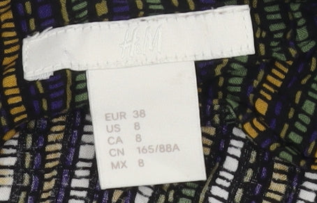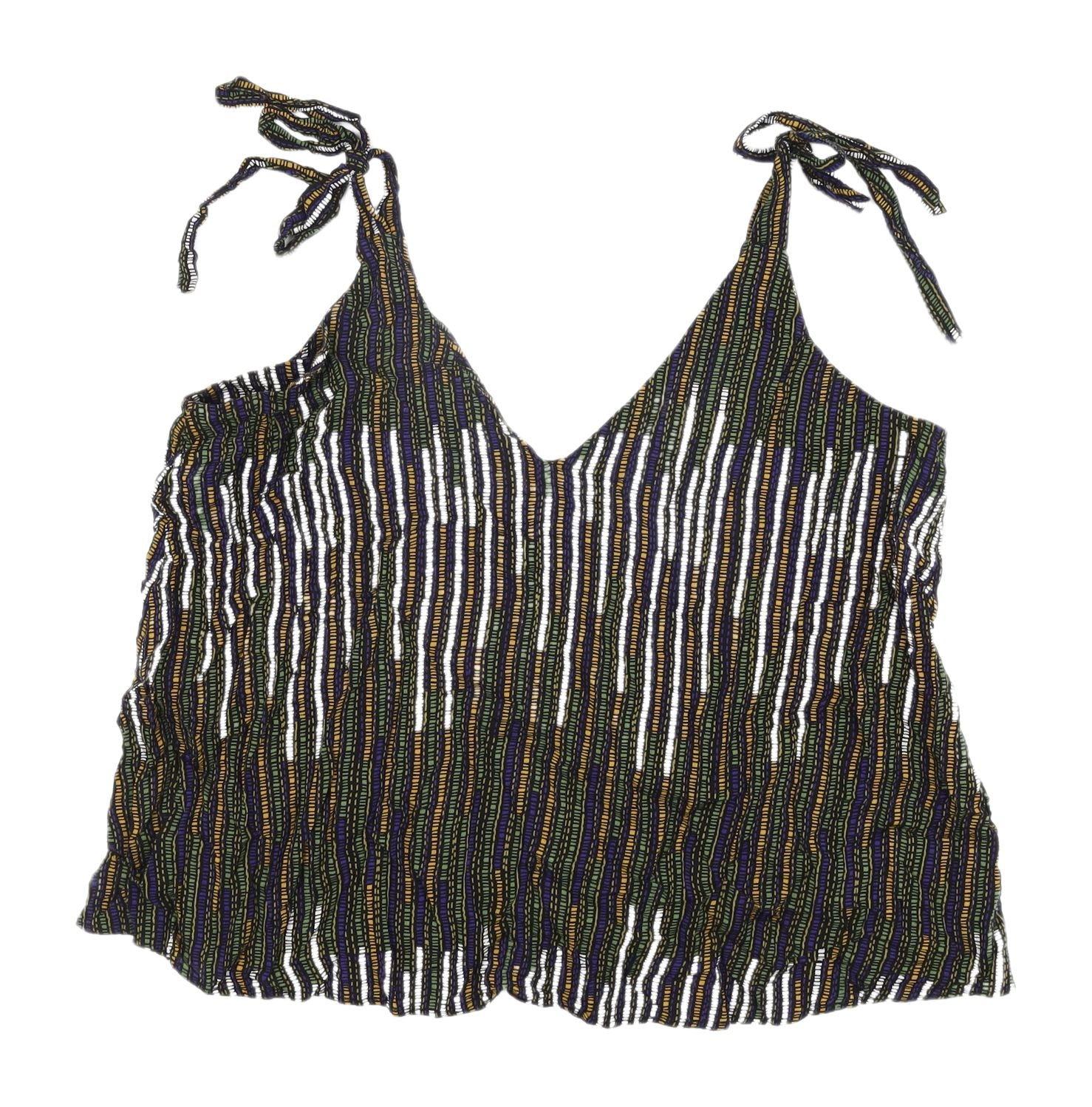 Elevate your casual wardrobe with this vibrant multicoloured striped camisole from H&M. Perfect for summer, this size 10 tank top offers a relaxed, regular fit that ensures comfort and style. Crafted from 100% viscose, the top features a lightweight and breathable fabric, making it ideal for warm weather. Its sleeveless design and V-neckline provide a flattering silhouette that enhances this piece's casual charm. The tie closure at the shoulders adds a trendy and adjustable feature, allowing you to customise the fit to your preference. Whether you're heading out for a casual day at the beach or a relaxed evening with friends, this tank top is versatile enough to suit any occasion. Pair it with your favourite jeans or shorts for a laid-back look, or layer it under a blazer for a slightly formal touch. Machine washable for easy care, this camisole is a practical yet stylish addition to any wardrobe. With its colourful stripe pattern, it's sure to add a pop of colour and personality to your ensemble. Grab this essential piece today and make everyday dressing a fashionable affair.
