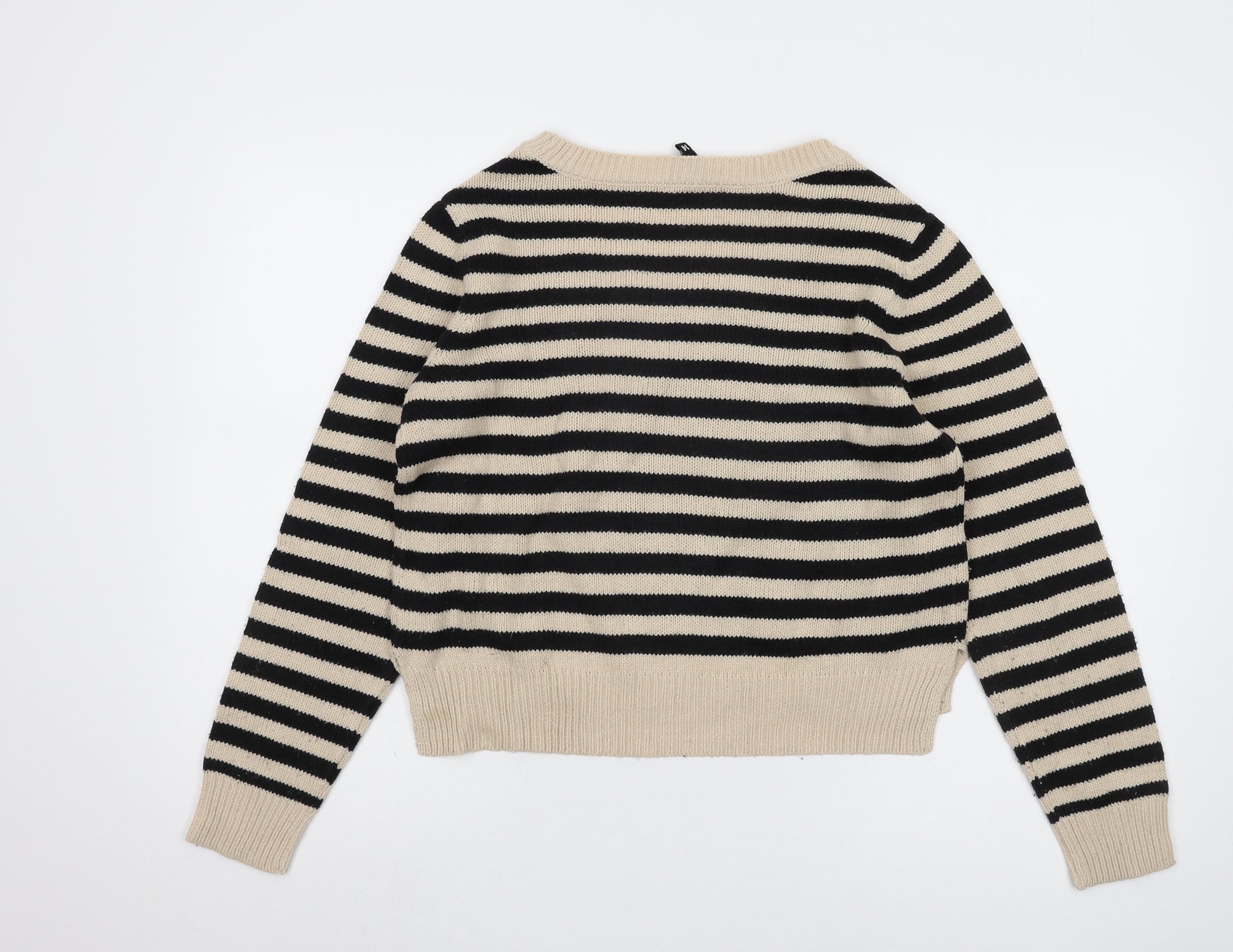 Add a touch of classic charm to your wardrobe with this H&M Women's Jumper, featuring elegant black and beige stripes. Crafted from acrylic, this knitwear offers a comfortable, regular fit perfect for casual occasions. The pullover style with a round neckline provides ease and a timeless look, making it a versatile choice for a variety of outfits. Available in size 12, this jumper is machine washable for easy care. With long sleeves, it's a great addition for layering in any season, ensuring you stay comfortable and stylish. A fantastic staple for those looking to combine comfort with chic sophistication.