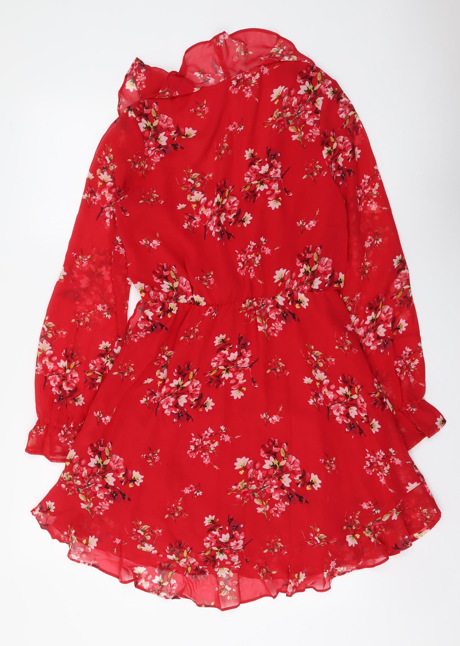 Womens Red Floral Polyester Fit & Flare Size L V-Neck Pullover