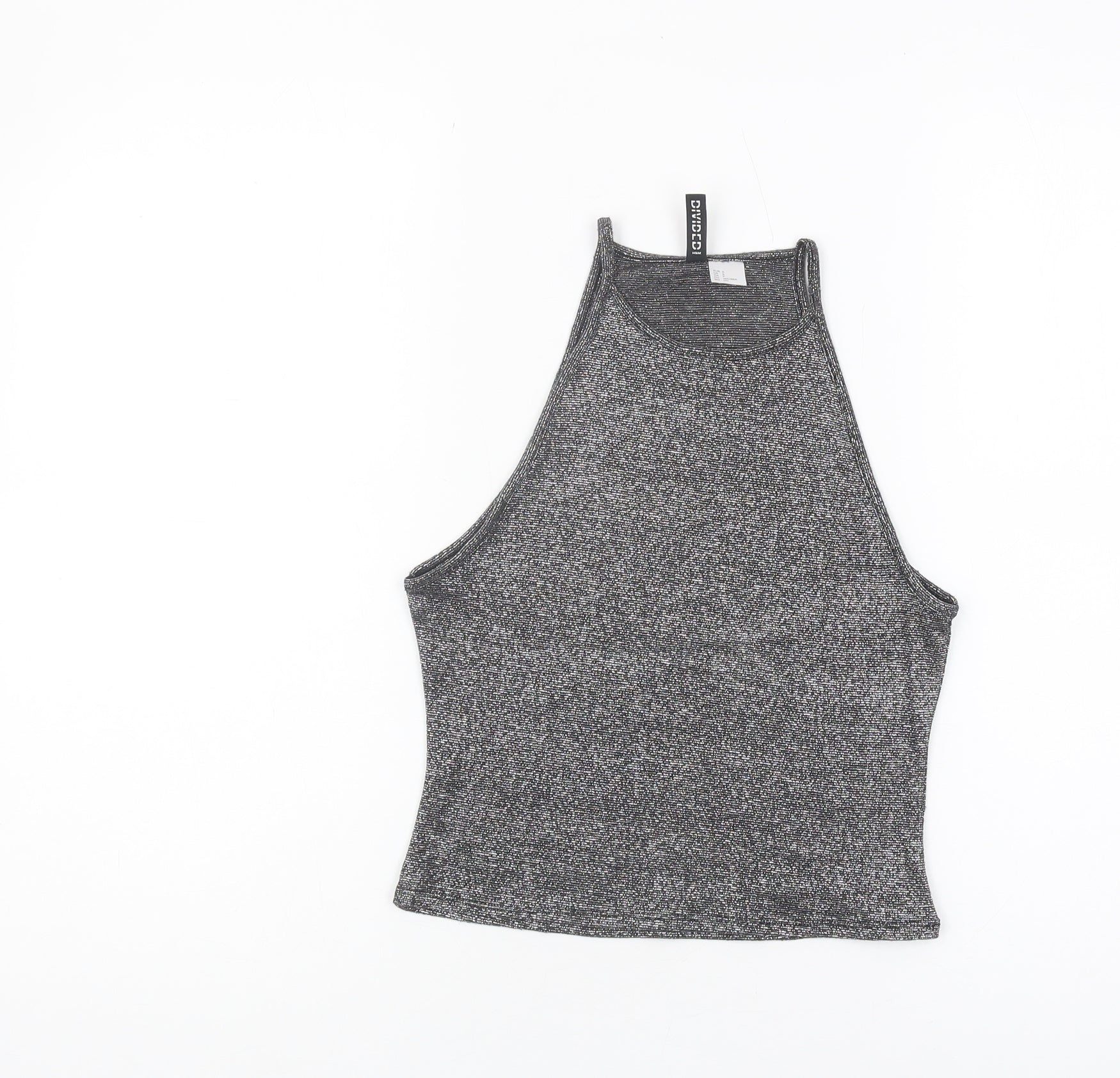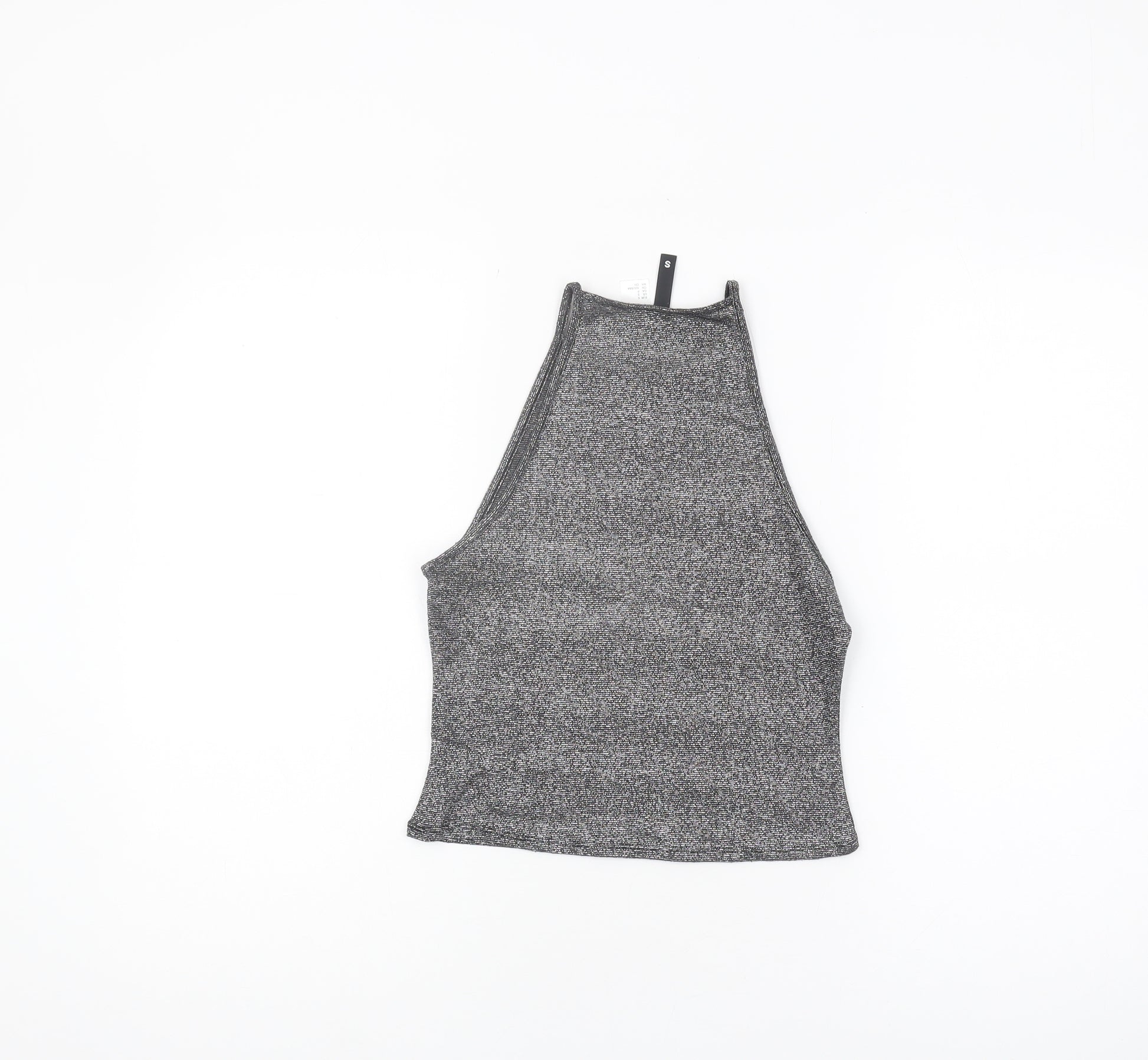 This stylish H&M camisole tank top is perfect for modern women looking to enhance their casual or party wardrobe. Designed with a high neck and a sleek silver hue, this top effortlessly combines contemporary fashion with comfort. Made from a blend of polyester and viscose, the fabric provides both a chic sheen and soft feel against the skin, making it ideal for a night out or a relaxed day event. The sleeveless design ensures breathability while the knit texture offers a hint of sophistication, ensuring that this top isn't just another basic. Easy to care for and machine washable, it's an excellent choice for both convenience and style. Though it lacks embellishments, its solid colour and modern fit inject a sense of elegance and versatility that can be paired with almost anything in your wardrobe. Whether layered under a jacket or worn solo, this tank top is your go-to apparel for effortless, chic style.