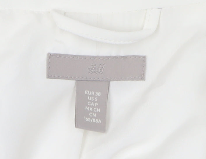Elevate your wardrobe with this chic H&M Women's Blazer in a crisp white shade, perfect for both casual and workwear occasions. Designed for a regular fit, this single-breasted suit jacket is crafted from a durable woven fabric blend of 96% polyester and 4% elastane, offering both style and comfort. The blazer features a notch lapel style and falls at a regular jacket length, making it a versatile addition to any outfit. Fully lined with soft polyester, it's easy to care for and is machine washable. Ideal for the warmer seasons of spring and summer, this elegant blazer has a sleek, modern appearance that pairs effortlessly with trousers or skirts. Despite its excellent condition, minor marks add a touch of character, making it a unique piece. Whether you're heading to a meeting or having a relaxed weekend brunch, this blazer is the perfect choice.