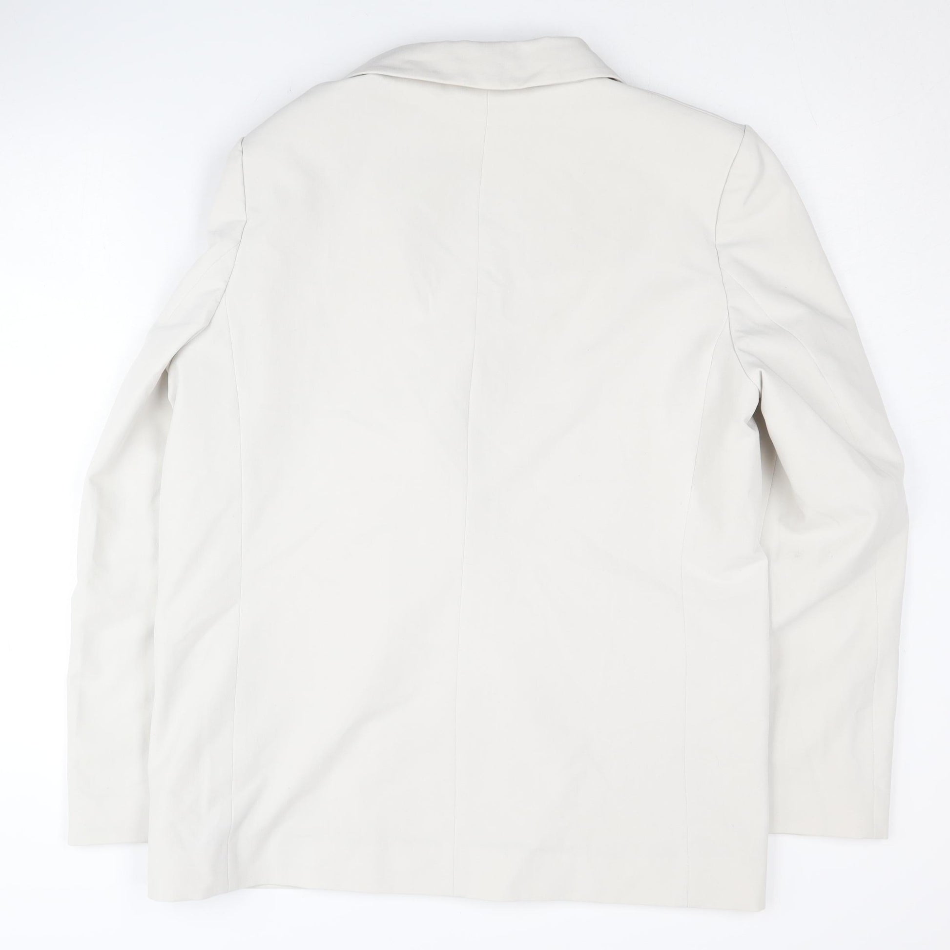 Enhance your wardrobe with this timeless H&M Women's White Blazer, perfectly tailored in a regular fit for a sophisticated touch. Crafted from a refined blend of polyester, viscose, and elastane, this blazer offers a smooth and comfortable wear suitable for any occasion. With its classic notch lapel style and double-breasted front, this blazer effortlessly combines elegance with modern trends. Featuring a lined interior for added comfort and structure, this blazer is ideal for layering over your favourite outfits. The two-button front closure offers a sleek finish, making it a versatile piece for both formal events and casual gatherings. In excellent condition, this blazer shows no visible damage, promising a reliable and chic addition to your ensemble. Perfect for all seasons, its regular-length cut flatters every silhouette, ensuring you always present your best self. Upgrade your wardrobe today with this stylish H&M blazer, an essential piece for the fashion-forward woman.