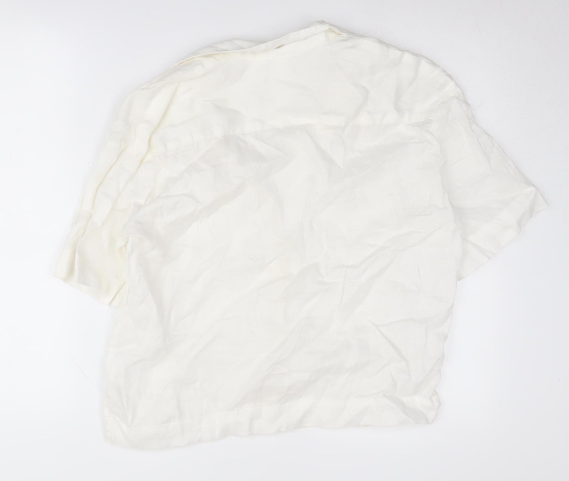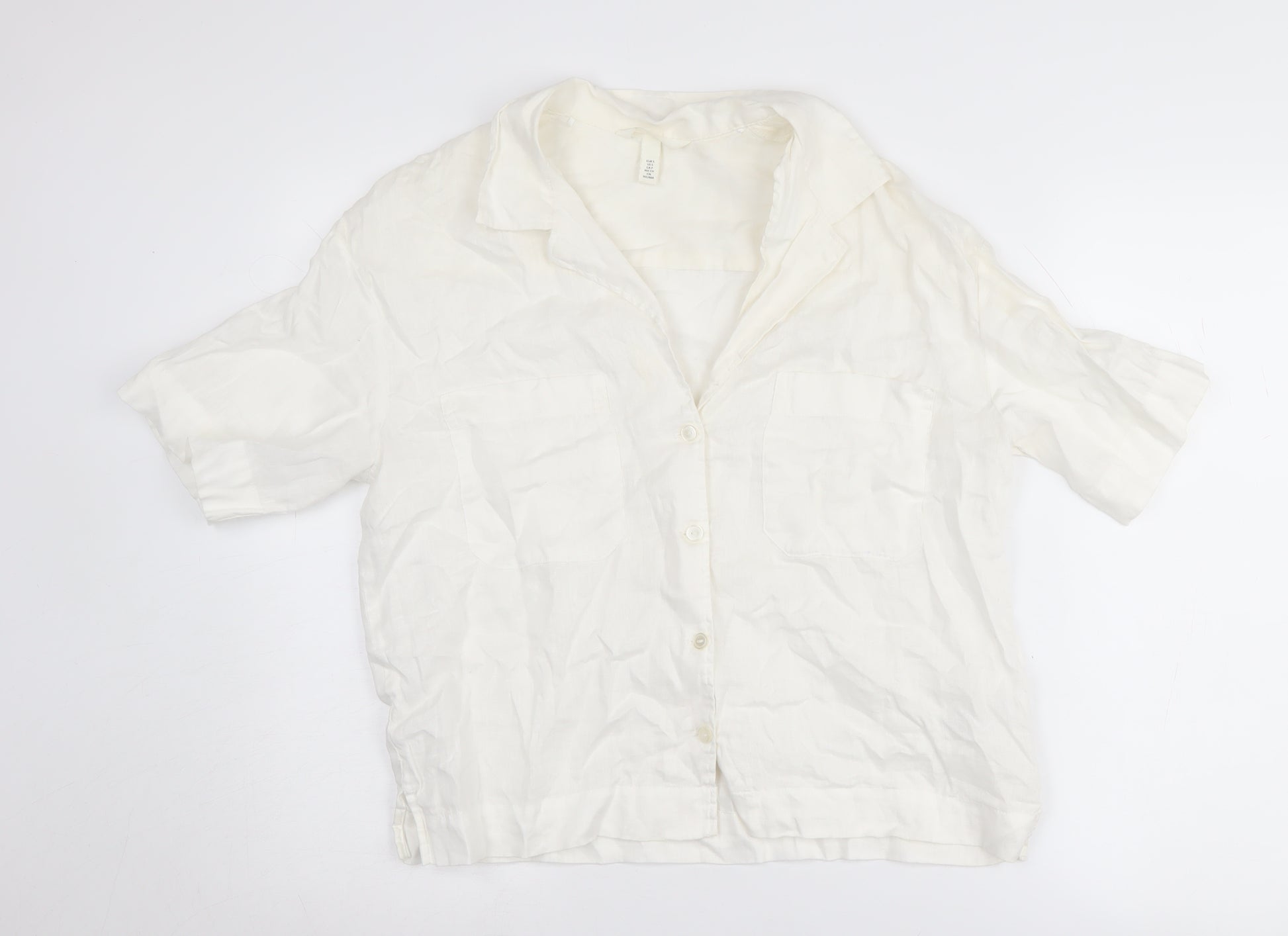 Discover effortless style with this H&M Women's White Linen Button-Up Shirt in size S, perfect for casual everyday wear. Made entirely from breathable linen, this shirt ensures comfort and a lightweight feel, making it ideal for summer outings or relaxed home settings. The classic collared neckline and short sleeves offer a timeless appeal, while the solid white colour provides versatility to blend seamlessly with any wardrobe. Designed for regular fit and crafted to accommodate a wide range of movements, this piece is perfect for those who prefer understated elegance. The button closure offers ease of wear, making it both functional and stylish. Although there is slight wrinkling visible, the shirt remains in excellent condition, and is machine washable for ease of care. This timeless piece can be dressed up with a skirt for an evening look or paired with jeans for a laid-back vibe. Embrace simplicity and sophistication with this essential wardrobe addition. A must-have for those seeking both fashion and comfort.