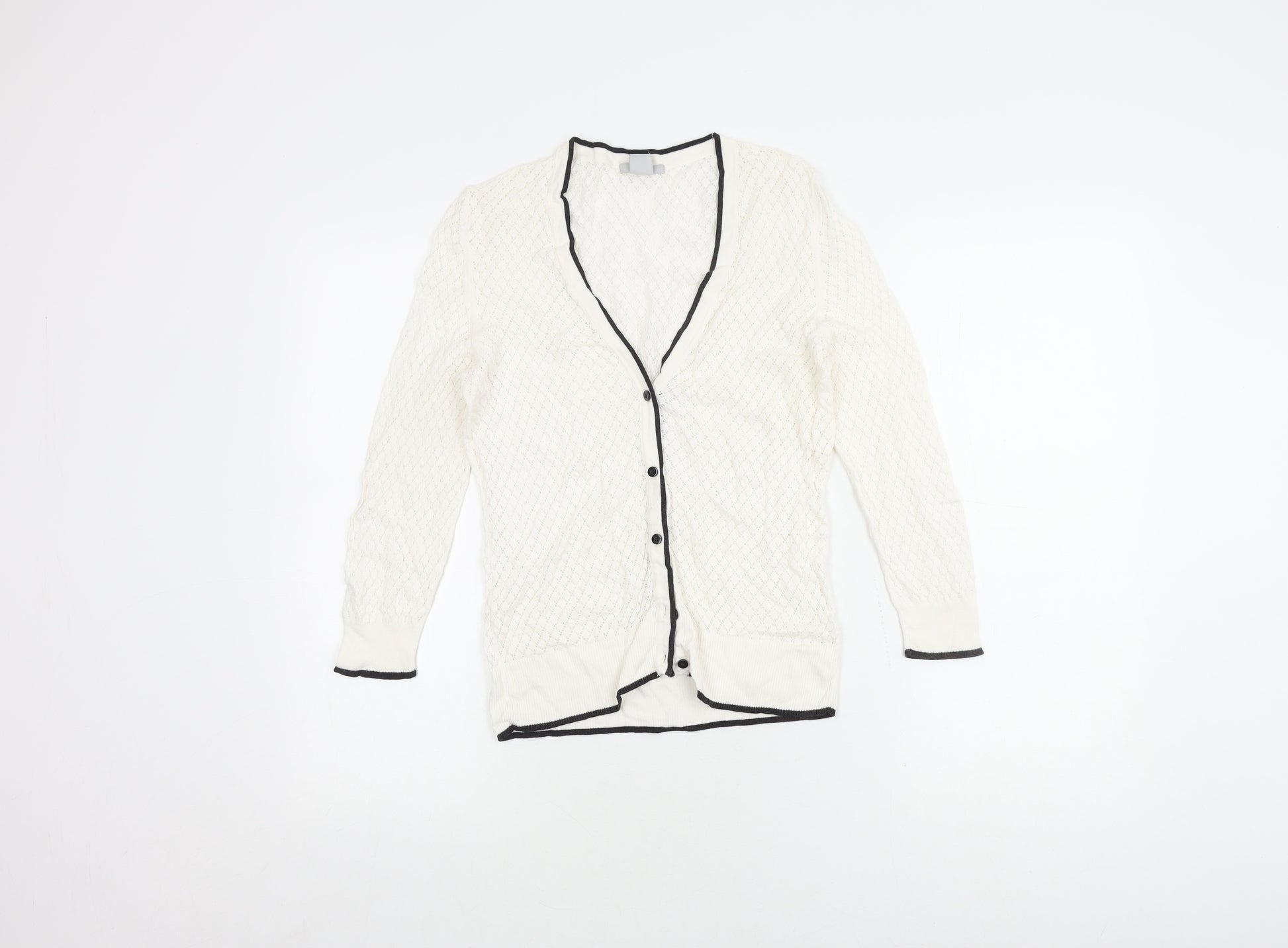 Elevate your wardrobe with this classic white cardigan from H&M, a versatile piece ideal for casual everyday wear. Crafted in a regular fit with a charming open-knit style and V-neck, this cardigan offers comfort and style. The long sleeves make it perfect for all seasons, while the button accents add a touch of elegance. Despite some visible stains, which require cleaning, this piece remains in very good condition. Whether you're headed to a casual meeting or a relaxed day out, this cardigan is a great choice. Its knit fabric and classic theme make it a timeless addition to any wardrobe.