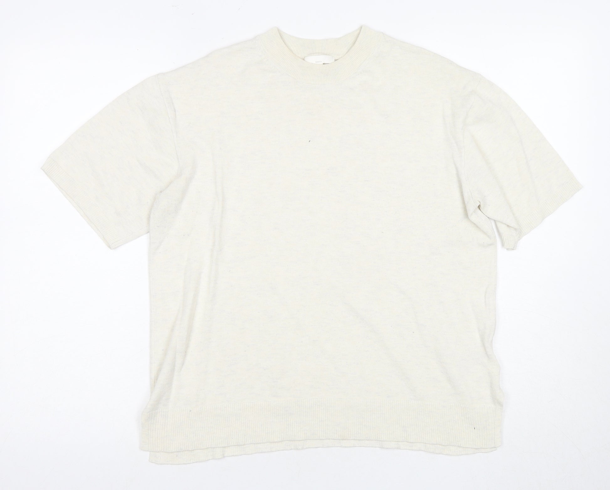 This H&M Women's Basic Knit T-Shirt is the ultimate classic piece for casual wear. Crafted from a soft and breathable material blend of 72% Viscose and 28% Polyamide, it offers a luxurious feel that keeps you comfortable all day long. The solid white colour adds a touch of elegance, making it easy to pair with any outfit, whether you're dressing up or keeping it simple. The regular fit and classic crew neck design provide a flattering silhouette suitable for any body type, while the short sleeves make it perfect for all seasons. Whether layered under a jacket in cooler weather or worn as is during warmer days, this T-shirt adapts to your styling needs effortlessly. Its machine-washable fabric ensures hassle-free care, making it a convenient choice for everyday wear.Ideal for casual occasions, from brunch with friends to a relaxed day at home, this top also works excellently as a base layer for more sophisticated outfits. With no visible flaws or wear marks, it's in excellent condition, ready to be added to your wardrobe essentials.Buy this H&M Basics knit T-shirt today and experience the perfect blend of comfort and style, ideal for fashion-conscious women looking to enhance their wardrobe with a timeless piece.