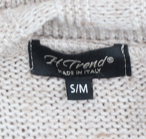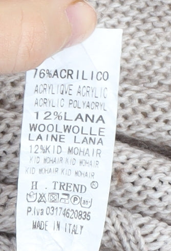This elegant H. Trend women's cardigan in a versatile beige shade is perfect for adding warmth and style to your wardrobe during the cooler months. The collared neckline and chunky-knit design combine classic elements with contemporary style, suitable for casual everyday wear or dressing up for more formal occasions. Crafted in Italy, this cardigan features a comfortable blend of acrylic, wool, and mohair, offering both softness and durability. The open design allows for easy layering, making it a useful addition to your wardrobe. With a regular fit and size small, this cardigan is tailored to suit many body types. Embrace the cozy and stylish silhouette of this cardigan, perfect for Autumn and Winter outings. Known for its excellent condition, this piece shows no visible signs of wear. Add a touch of classic charm to your collection with this timeless knitwear piece.