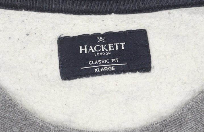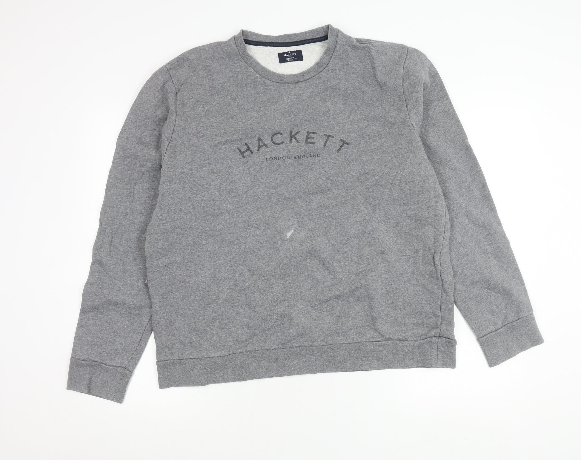 Upgrade your casual wardrobe with this Hackett London men’s sweatshirt, crafted in a timeless grey tone and styled for versatile, everyday wear. Designed in a classic pullover style, this piece embodies understated sophistication while offering maximum comfort. Cut in an XL size with a classic fit, it provides a flattering yet relaxed silhouette suitable for layering or wearing on its own. The sweatshirt is constructed entirely from 100% cotton, delivering a soft and breathable jersey fabric that feels great against the skin while promising durability and longevity. Featuring a crew neckline and long sleeves, this essential makes an ideal choice for cooler weather across autumn, winter, and spring seasons.The front displays the iconic Hackett London logo, which adds a refined and collegiate-inspired accent, making it both stylish and versatile. Its pullover design makes it easy to throw on for casual outings, lounging at home, or layering with jackets for a smart-casual look. The graphic print logo elevates an otherwise minimalist style, presenting an effortlessly chic edge.Although pre-owned in good condition, please note the presence of a small hole on the front fabric, reflected in the pricing. Despite this minor imperfection, the sweatshirt remains structurally sound and retains its premium appearance and comfortable wear. A wardrobe essential, this Hackett sweatshirt works well for modern gents who appreciate quality and subtle branded detail without compromising comfort.Perfect for pairing with jeans, chinos, or joggers, this sweatshirt is as versatile as it is stylish, delivering the quality and prestige one expects from Hackett London. Whether you’re dressing for a laid-back weekend, running errands, or casual social occasions, this piece offers dependable wear and longstanding appeal. Make it a staple in your rotation and enjoy Hackett craftsmanship in this classic fit design.
