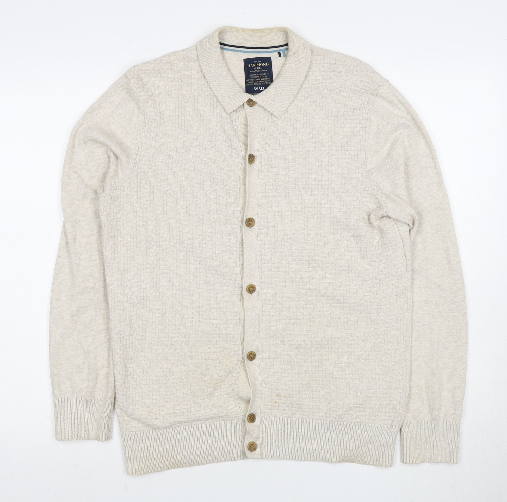 Crafted by Hammond & Co., this men's cardigan offers a classic style infused with timeless elegance. In a versatile beige hue, it features collared neckline and button accents, making it perfect for a range of casual occasions. Manufactured from soft, 100% cotton knit fabric, it provides comfort and breathability for all seasons. With a regular fit and long sleeves, this cardigan is an essential addition to a man's wardrobe. Its neutral shade and simple design allow it to seamlessly integrate into various outfits. Sized small, it aligns well with regular size types, offering an ideal fit for those who appreciate understated style. Whether paired with trousers or jeans, this cardigan adapts to both relaxed and smart-casual vibes effortlessly. Though pre-owned, it remains in good condition with only light wear visible, adding character without compromising on quality. Ideal for those who appreciate both comfort and fashion, this cardigan is machine washable for easy care, ensuring longevity. Secure this wardrobe staple today and step up your sartorial game.