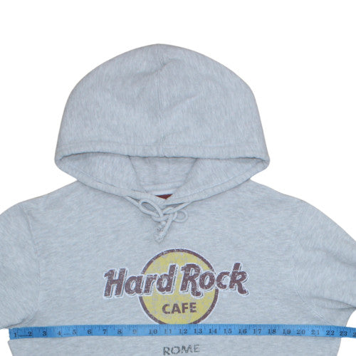 This Hard Rock Cafe Rome men's hoodie offers laid-back style with a touch of classic rock appeal. Crafted from a soft and durable cotton-polyester fleece blend, this grey pullover hoodie provides warmth, comfort, and a timeless everyday fit. The hoodie features the iconic Hard Rock Cafe logo with 'Rome' text across the chest in an eye-catching graphic print, representing one of the brand’s most memorable global destinations. Designed with a drawstring hood, ribbed cuffs and hem, and a roomy front pouch pocket, it’s both practical and comfortable for casual wear throughout the year. Ideal for layering on cooler days, the brushed fleece interior ensures a cosy feel against the skin, while the medium weight fabric makes it versatile enough for autumn through spring. The regular fit flatters most body types, offering freedom of movement without feeling bulky. Whether you’re relaxing at home, heading out for a casual day, or showing your love for rock culture and travel, this hoodie easily complements jeans, joggers, or shorts. This garment is machine washable, ensuring easy care and long-lasting wear. Although pre-owned, it remains in excellent condition with light wear evident in the printed logo, adding to its authentic Hard Rock charm. A must-have addition for hoodie collectors and music fans alike, this Hard Rock Cafe Rome hoodie combines cosy comfort with a world-famous design that's both effortlessly stylish and meaningful. Perfect for nostalgic collectors, frequent travellers, or anyone who appreciates iconic global brands that stand the test of time.