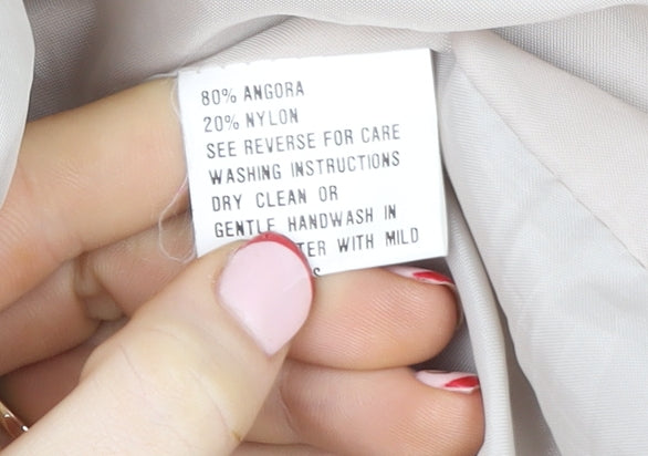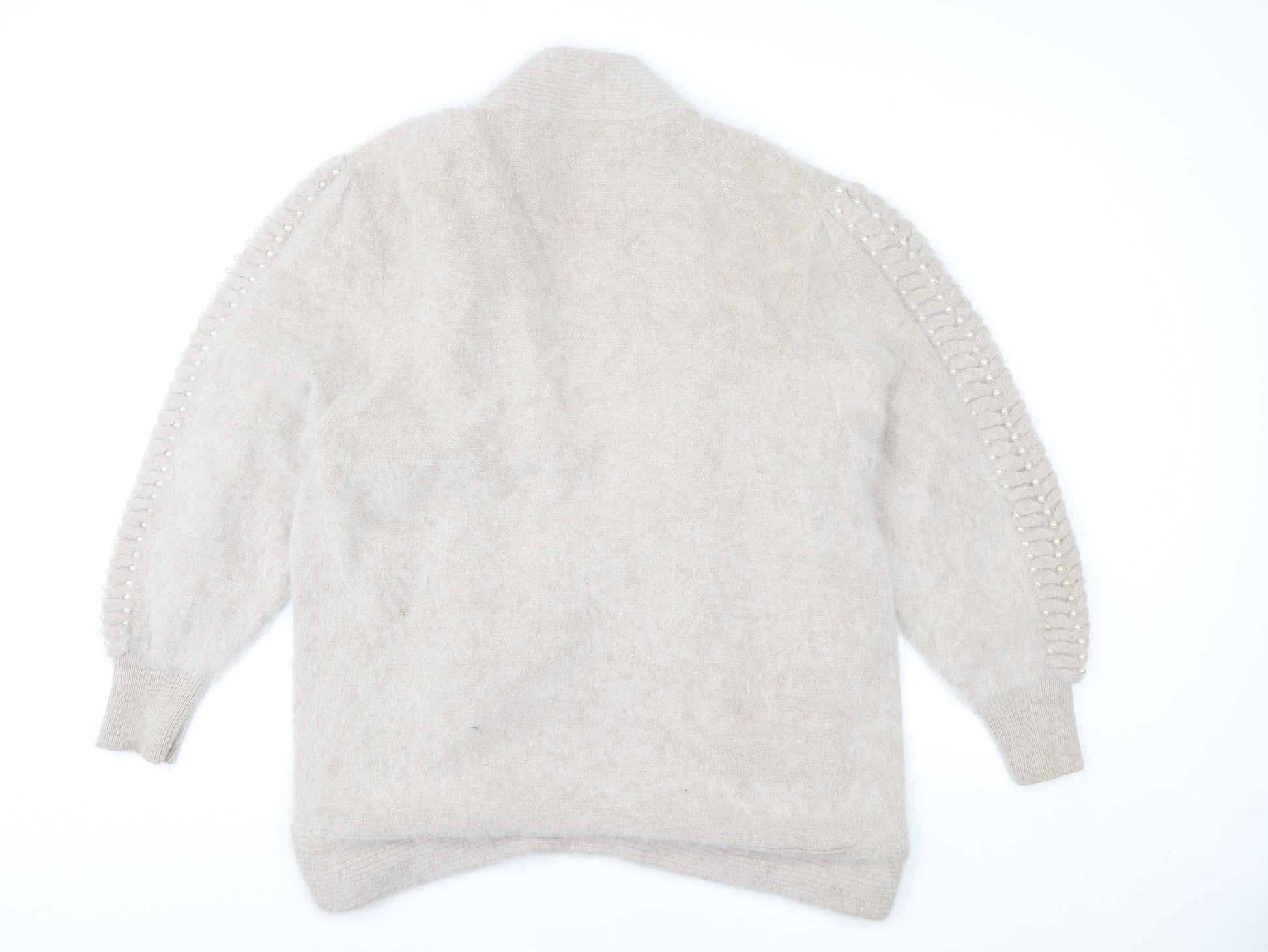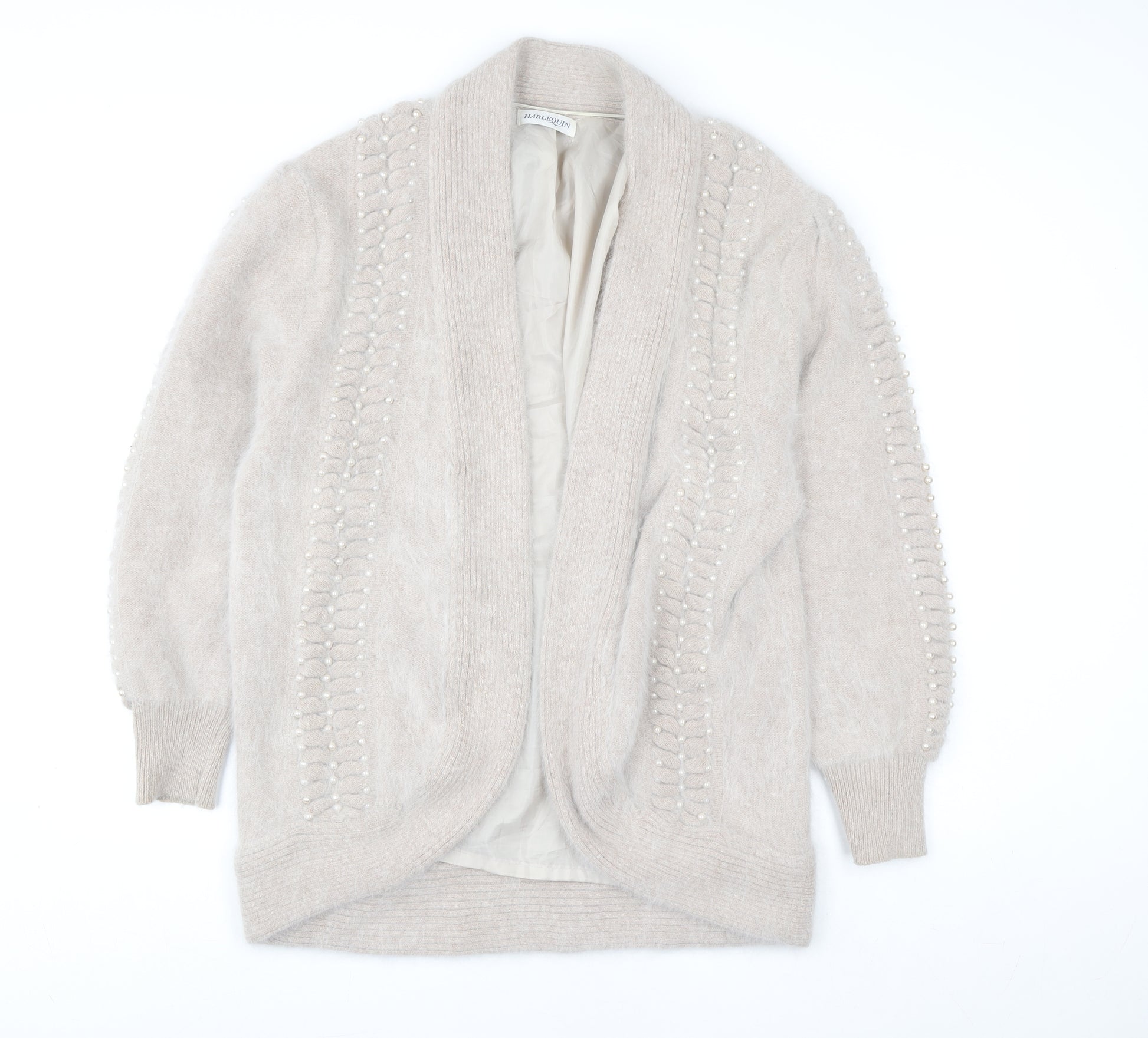 Wrap yourself in pure elegance with this luxurious Harlequin women’s cardigan in a soft beige tone. Crafted from a premium blend of 80% angora and 20% nylon, this piece offers exceptional warmth, comfort, and a plush texture that feels wonderfully soft against the skin. The open front design and ribbed shawl collar create a flattering drape, making it an ideal layering piece for cooler seasons. Decorated with delicate beaded accents intricately placed along the sleeves and front panels, this cardigan exudes timeless sophistication and a subtly glamorous edge. The relaxed fit and long sleeves provide ease of wear, perfect for both laid-back occasions and more refined gatherings. Its lightweight knit construction ensures breathability, while the angora fibres bring a luxurious, fluffy finish that enhances texture and shape. Pair it effortlessly with jeans for everyday style or layer over a dress for an elegant evening look. Ideal for autumn and winter, this cardigan is a wardrobe essential for anyone who loves understated luxury and classic charm. In excellent pre-owned condition with minimal signs of wear, this piece remains ready to impress. The versatile beige hue makes it easy to coordinate with a range of colours and outfits, establishing it as a go-to garment season after season. Treat yourself or a loved one to the unmatched comfort and refined design of this Harlequin beaded cardigan and experience a blend of modern femininity and timeless appeal that’s ideal for any casual or semi-dressy occasion.