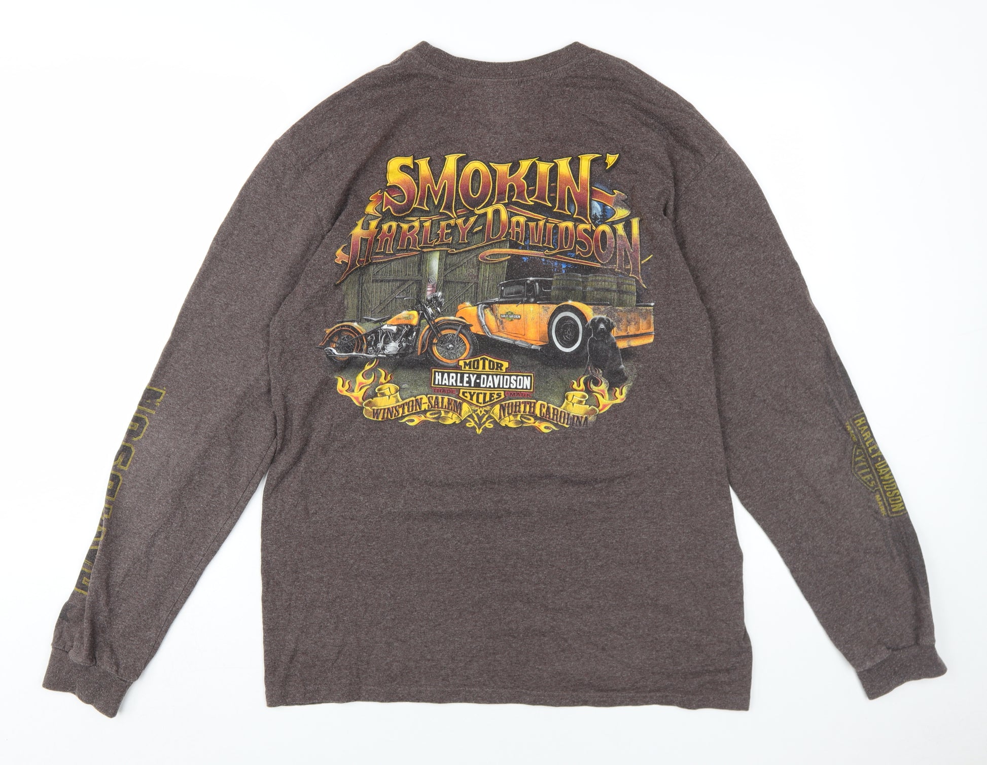 Elevate your casual wardrobe with this classic Harley-Davidson men's t-shirt, perfect for motorcycle enthusiasts and fans of iconic American brands. Crafted from a comfortable blend of 50% cotton and 50% polyester, this brown knit tee promises a soft feel and durable wear. The graphic print features a vintage Harley-Davidson motorcycle, invoking a sense of adventure and road trips. Designed with long sleeves, this tee is suitable for all seasons, offering a regular fit that ensures all-day comfort. The crew neck adds to the classic style, making it a versatile piece for any casual outing. Whether you're heading out for a ride or simply enjoying a relaxed weekend, this t-shirt is sure to make a statement. Don't miss out on owning a piece of authentic Harley-Davidson apparel.