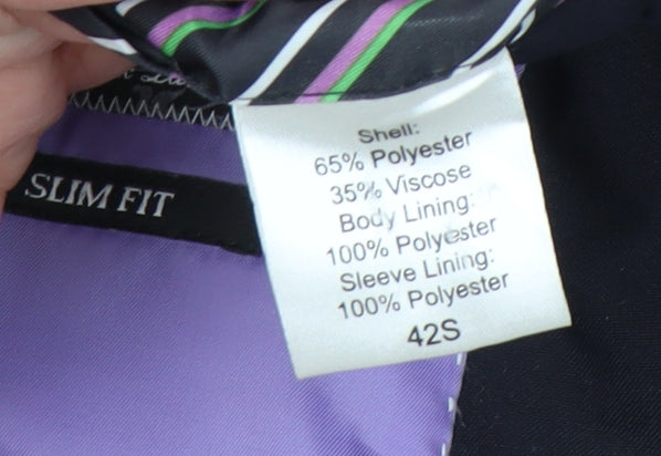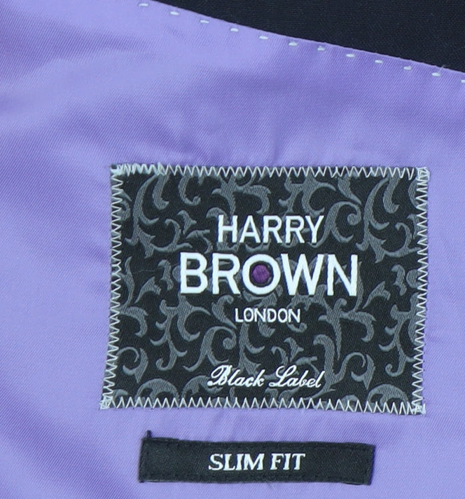 Elevate your formalwear collection with this refined Harry Brown London Black Label slim fit blazer, designed to bring both sophistication and versatility to your wardrobe. Crafted with care, this jacket is cut in a flattering slim fit that offers a tailored silhouette, perfect for modern styling. The classic black exterior is enhanced by a bold purple lining that adds a touch of luxury and character to the design, ensuring you stand out in understated elegance.Made from a durable and comfortable blend of 65% polyester and 35% viscose, this blazer combines resilience with soft wearability, making it ideal for long events, business functions, and special occasions alike. The material offers a smart drape while keeping maintenance straightforward, as it is recommended for dry clean only. The label confirms this jacket is a size 42S (short length fit), with a chest size of 42, making it perfectly suited for those seeking a structured, slim-fitting blazer.This single-breasted jacket features a notch lapel for timeless appeal, fastened with a two-button front for a sleek and classic closure. Additional fine tailoring details include flap front pockets, an inner pocket for practical storage, and a double-vented back to allow for improved movement and comfort. The sleeve is neatly finished with a three-button cuff, highlighting its well-crafted construction.The Harry Brown brand is renowned for producing contemporary menswear infused with classic British tailoring influences, and this piece certainly reflects that ethos. Its smart, modern cut makes it appropriate for a wide range of occasions including business meetings, weddings, cocktail parties, and formal gatherings. Whether paired with suit trousers for a complete formal ensemble, or worn with chinos or dark denim to balance elegance with a smarter-casual twist, this blazer offers excellent versatility.In very good condition, this jacket shows only light signs of wear with no damages, making it a stylish and affordable addition to any wardrobe. A perfect choice for those who value tailored cuts and premium detailing without compromising on comfort or practicality, this Harry Brown London blazer provides enduring style at excellent value.