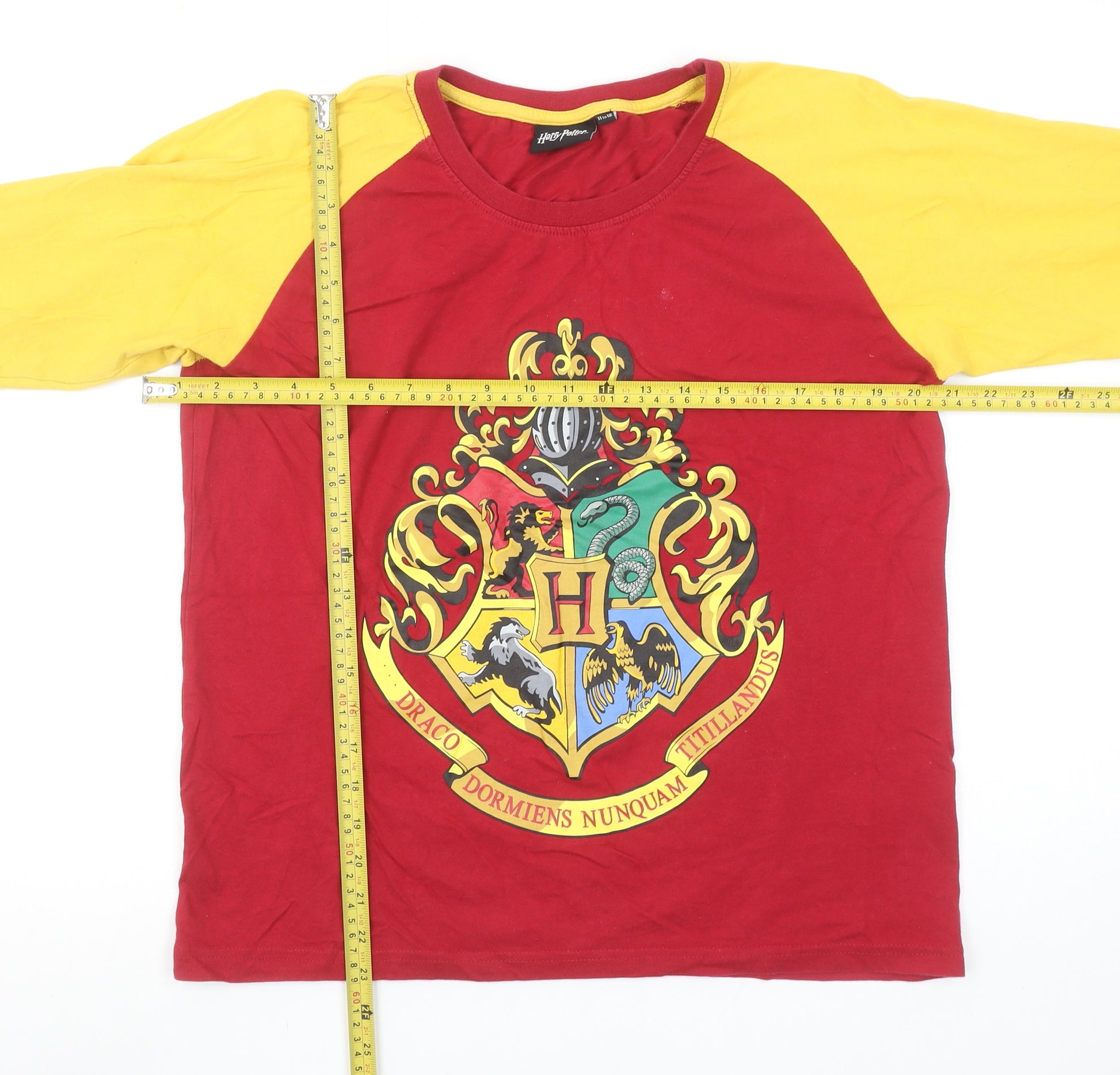 Bring a touch of wizarding magic to bedtime with this officially licensed Harry Potter girls' pyjama top. Designed in a bold red and yellow colourway inspired by Gryffindor house pride, this long-sleeved top features the iconic Hogwarts crest across the chest, celebrating all four houses — Gryffindor, Slytherin, Ravenclaw, and Hufflepuff — in rich, detailed print. Crafted from 100% cotton jersey, the material feels soft, breathable, and comfortable against the skin, making it perfect for a cosy night’s sleep or lounging around the house. The cotton fabric ensures durability while allowing easy movement, keeping wearers snug and comfortable throughout every season.Ideal for girls aged 11 to 12 years, this pullover-style pyjama top is both practical and stylish, with a crew neckline and contrast-raglan sleeves in a warm, golden hue. It’s lightweight yet well-made, offering a flattering relaxed fit without any restrictive features. Simple to care for, the top is machine washable and easy to maintain, ensuring it remains a bedtime favourite wash after wash.This piece forms part of a pyjama set, though the listing is for the top alone. A perfect gift for any young Harry Potter fan, it captures the magical spirit of the films while being comfortable enough for everyday sleepwear. Whether for lounging on movie nights, reading under the covers, or simply showing Hogwarts pride, this pyjama top adds a whimsical and fun touch to nighttime routines. Offer your child comfort and style with this enchanting Harry Potter pyjama top — a must-have addition to any young fan’s wardrobe.