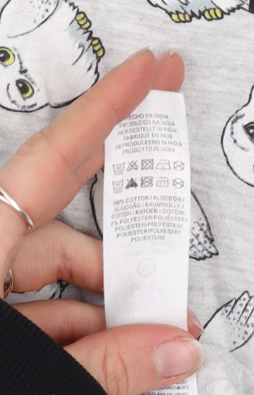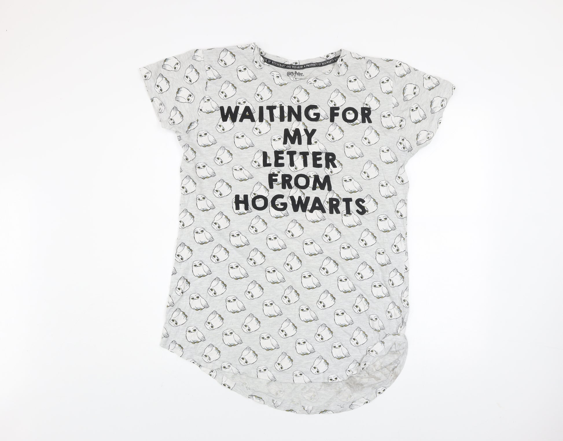 Step into the magical world of Hogwarts every night with this enchanting Harry Potter women’s nightshirt. Designed in a soft light grey jersey fabric, this wonderfully comfortable T-shirt style nightshirt features the beloved owl Hedwig in a fun all-over print. Across the chest, bold black lettering reads 'Waiting for my letter from Hogwarts', giving this piece a charming touch of wizarding humour. Tailored from a breathable blend of 98% cotton and 2% polyester, the fabric feels soft and cosy, ensuring all-night comfort whether you wear it for sleeping or lounging at home.The relaxed fit and short sleeves make this nightshirt perfect for warmer seasons such as summer or spring, while its lightweight cotton material keeps you cool through autumn nights. The classic crew neckline provides a timeless silhouette that suits every casual bedtime look. Officially licensed Harry Potter merchandise, this piece is ideal for fans who want to add a little magic to their nighttime wardrobe. In a medium UK women’s size 10-12, this nightshirt offers a loose, comfortable fit ideal for winding down after a busy day. The grey tone and black printed details give it a simple yet stylish look that pairs perfectly with your favourite slippers or lounge trousers. The item remains in excellent pre-owned condition, showing only gentle signs of wear with vibrant print and no damage. Practical and easy to care for, this machine washable nightshirt is a delightful gift for any fan of the series or a treat for yourself. Make bedtime magical with this playful Harry Potter 'Waiting for My Letter from Hogwarts' nightshirt, combining cosy comfort, whimsical style, and a beloved fandom theme.
