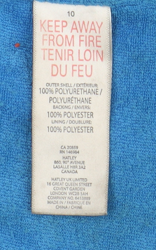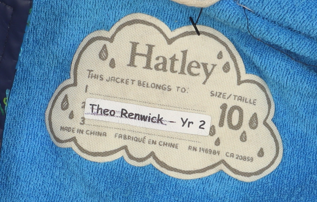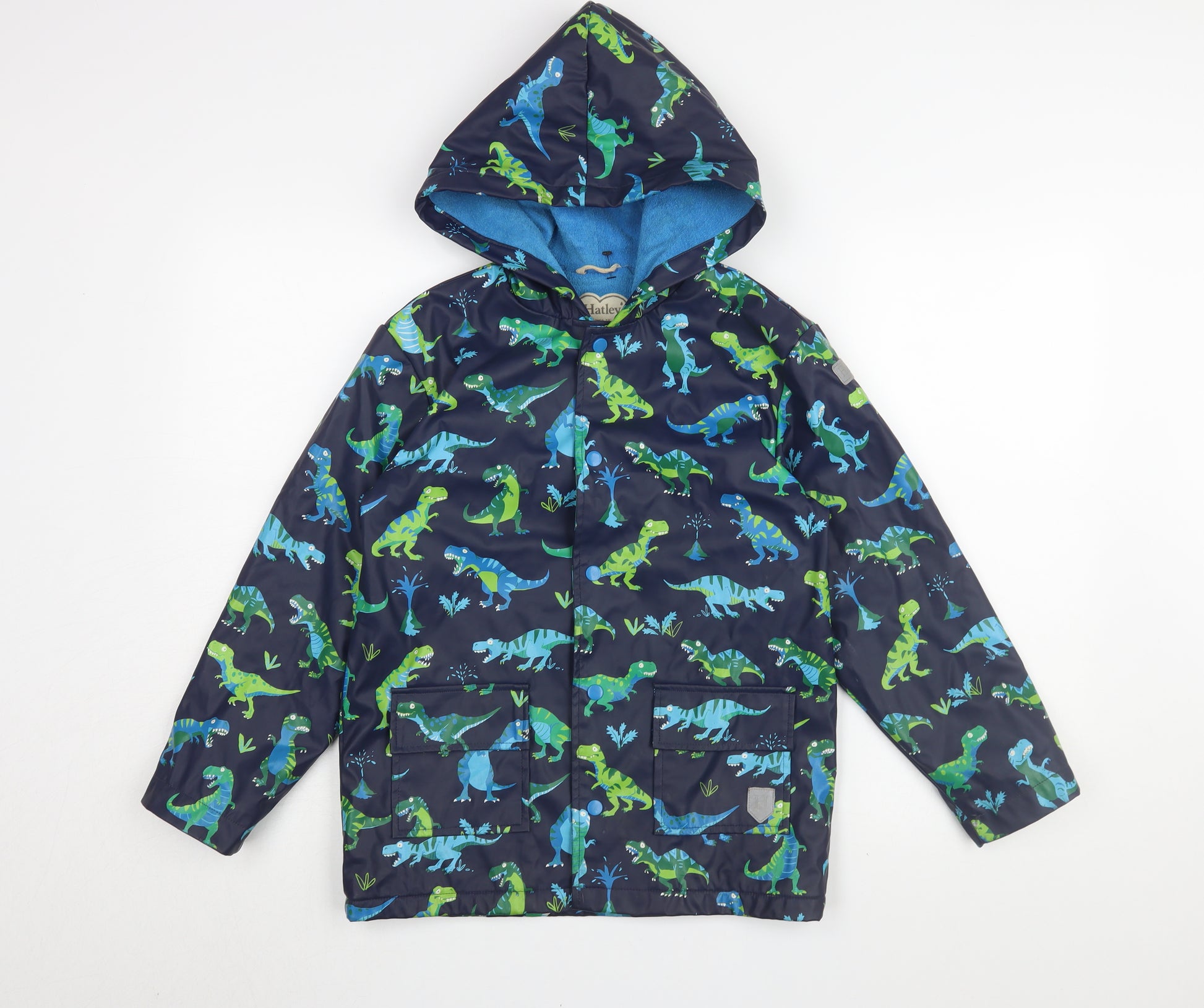 Splash into fun with this vibrant Hatley Boys Dinosaur Rain Coat. Perfect for adventurous kids, this coat is designed with a playful multicoloured dinosaur print, sure to brighten up any rainy day. Made from 100% polyurethane, it provides excellent waterproof protection, ensuring your child stays dry and comfortable in all seasons. The coat features a convenient hood and long sleeves, making it ideal for casual walks and everyday wear. Its snap closure ensures easy on and off, while the polyester lining adds a layer of comfort. This mid-length rain jacket is tailored in a regular fit, allowing your child to move freely and enjoy any outdoor activity. With a machine washable design, maintenance is as effortless as it gets. Although it's used with slight signs of wear, it remains in excellent condition. Give your little dino-lover a reason to love rainy days with this charming Hatley raincoat.
