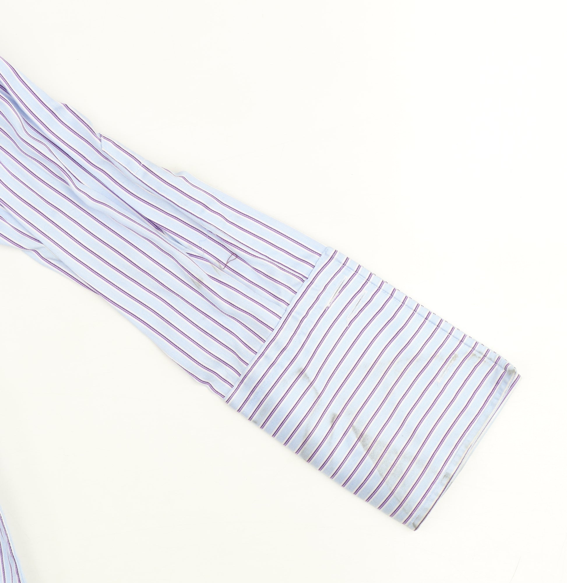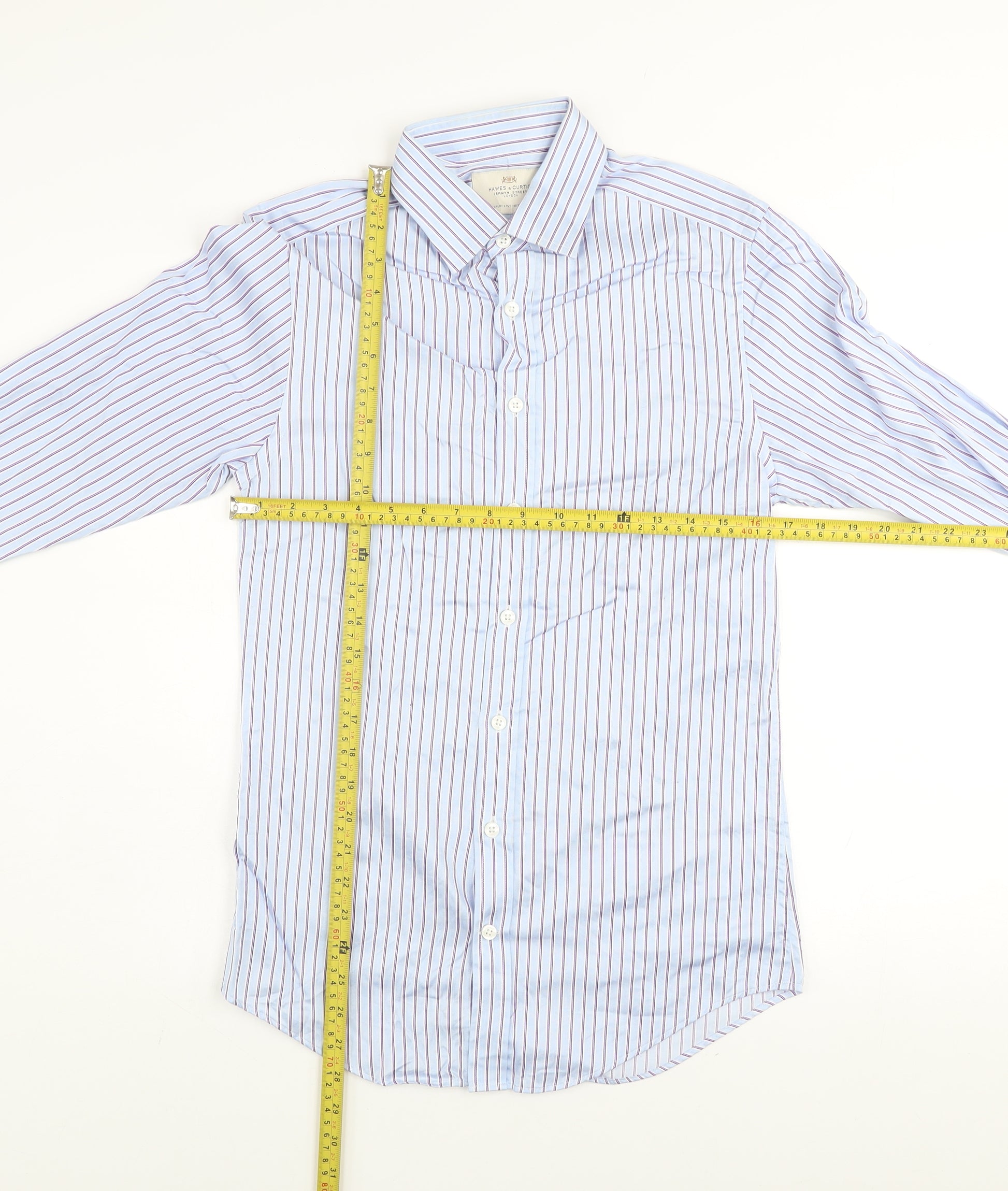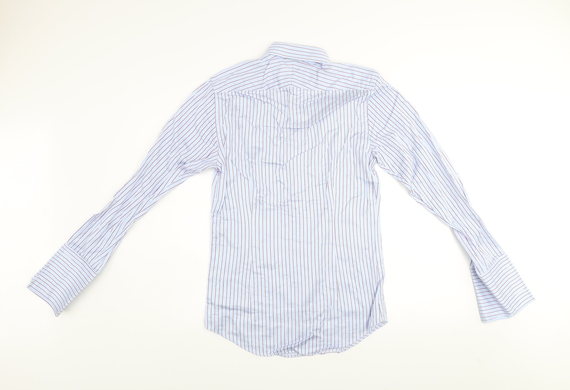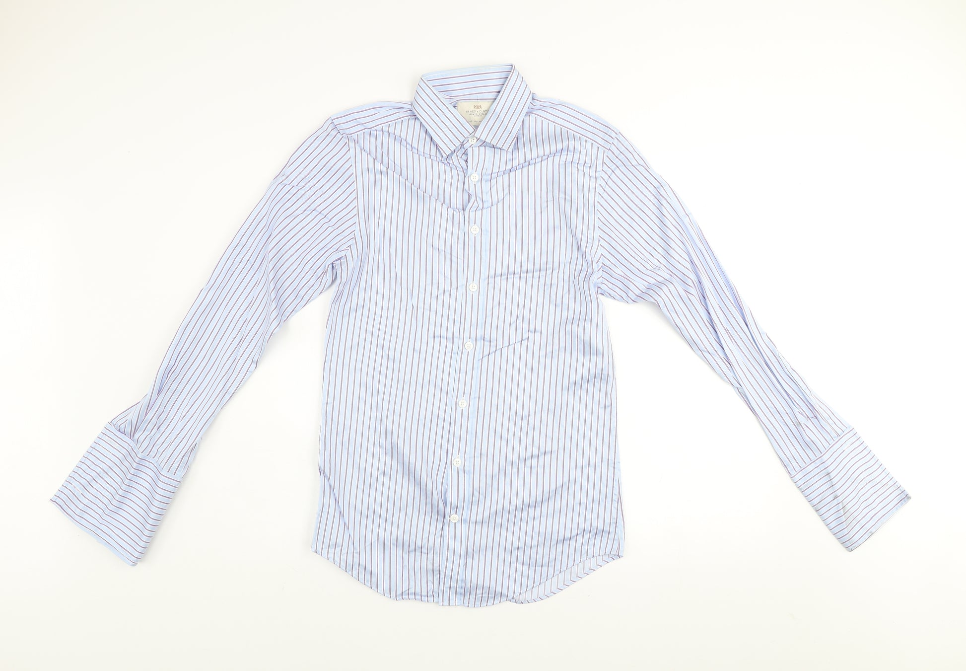 Elevate your formal wardrobe with this sophisticated blue striped dress shirt from Hawes & Curtis, one of Jermyn Street’s most renowned tailors. Expertly crafted from premium 100% cotton, this luxury 2-ply fabric offers remarkable softness, breathability, and durability for lasting comfort throughout the day. Designed in an Extra Slim Fit silhouette, the shirt provides a sharp, modern profile ideal for the contemporary gentleman who appreciates elegance and structure. The fine vertical stripe pattern in blue and purple tones delivers a timeless, professional aesthetic suitable for both corporate meetings and formal occasions.The shirt features a classic point collar that pairs perfectly with ties, a full button front closure, and French cuffs adding a refined touch suitable for cufflinks. Its woven texture enhances the shirt’s luxurious look and feel, while the light fabric wash keeps the overall tone crisp and clean. With its collared neckline and structured form, this shirt transitions seamlessly from boardroom presentations to evening events.This garment is machine washable, making it an easy-care option for those with a busy schedule. The visible markings on the sleeve and minor creasing are cosmetic signs of previous use, but the shirt retains its excellent structure and premium finish. Perfect for business, formal events, weddings, or workwear, this piece captures the unique blend of British tailoring heritage and modern styling. Designed to impress, it’s the ideal addition to any gentleman’s rotation, combining timeless design, quality craftsmanship, and understated sophistication at outstanding value. A true representation of classic Hawes & Curtis tailoring.