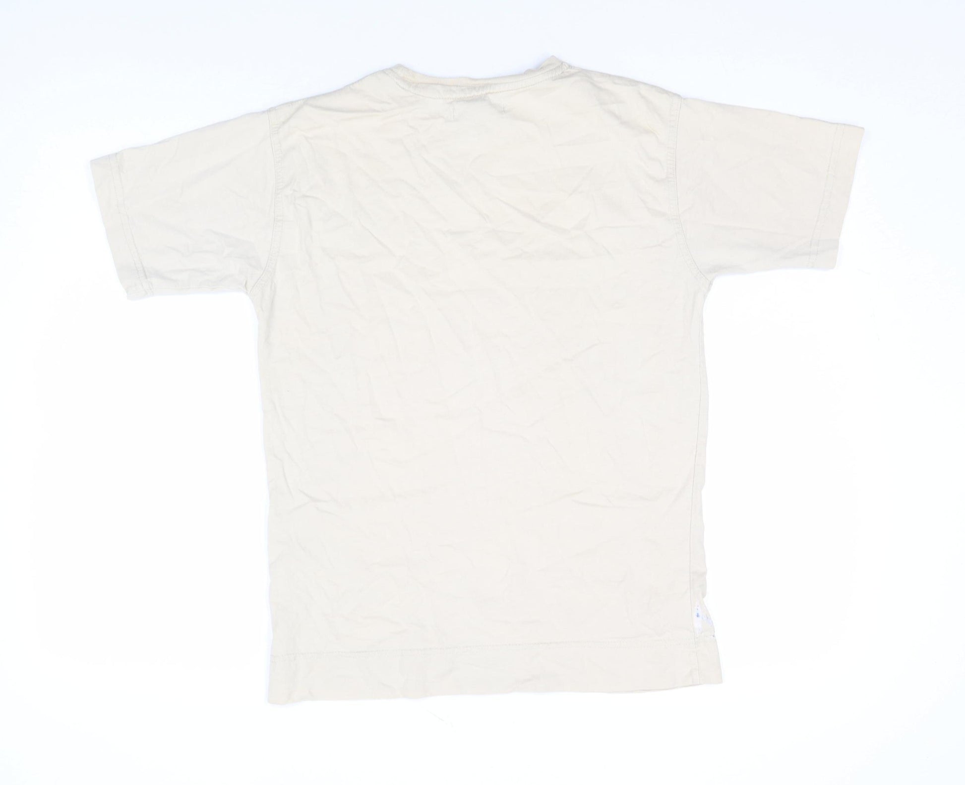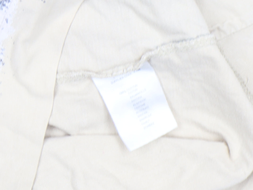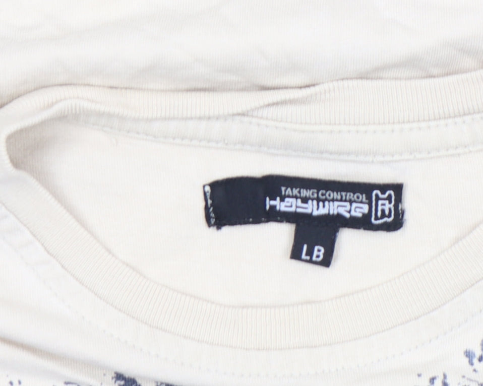 This Haywire men’s beige graphic print T-shirt delivers effortless casual style with a retro edge. Crafted from soft, breathable 100% cotton jersey, it ensures lasting comfort and an easy fit, perfect for everyday wear through spring, summer, and autumn. Featuring a crew neckline and short sleeves, this lightweight tee pairs equally well with jeans, shorts, or joggers. The bold navy abstract print across the front and back lends a vintage-inspired feel with a contemporary twist, elevating an essential basic into something special. Cut with a regular fit, the Haywire ‘Taking Control’ graphic T-shirt is designed for relaxed movement and all-day comfort. The natural cotton fabric makes it machine washable, soft to the touch, and easy-care. Subtle logo detailing and printed accents highlight the brand’s casual streetwear heritage. The neutral beige tone complements a wide range of wardrobes, suiting both understated and expressive style combinations.The T-shirt remains in very good used condition, showing only light fading consistent with wear and one small faint mark on the front. No holes or damage are present, and the seams and print are intact. Ideal for relaxed weekends, skate culture enthusiasts, or anyone who prefers a laid-back, authentic look, this piece captures the perfect blend of comfort, durability, and visual interest.Whether layered under a zip hoodie or worn on its own, this Haywire graphic tee works across multiple seasons and settings. It’s a versatile staple that embodies confident, everyday style with its unique distressed-look print and premium softness. A great choice for those seeking reliable, comfortable cotton wear with distinctive design appeal.