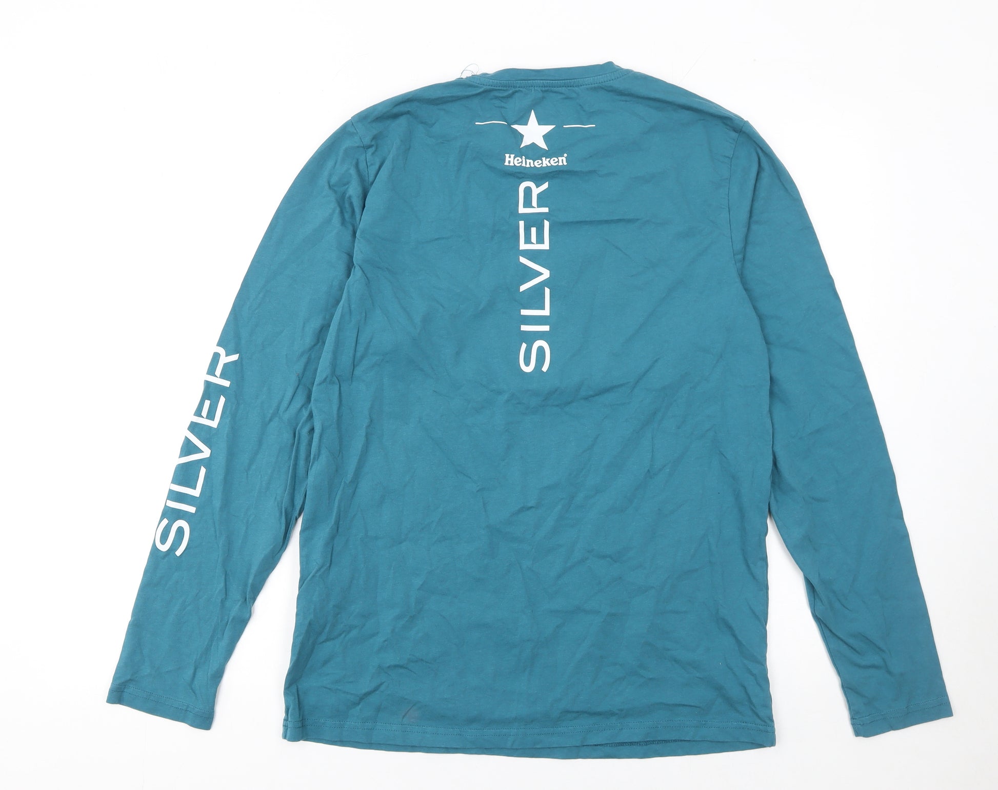 Show your laid-back style and appreciation for premium quality with this Heineken Silver long sleeve men’s T-shirt. Crafted from 100% bio-cotton for a breathable and sustainable feel, this shirt combines comfort with a striking beer-inspired design. The rich turquoise-blue tone is complemented by bold ‘Heineken Silver’ logo branding printed across the chest, sleeve, and upper back, lending a modern, graphic edge to a classic casual piece. The soft, jersey cotton fabric ensures a relaxed and comfortable fit that makes it ideal for everyday wear or as a standout top for social occasions and events. Designed with a crew neckline and long sleeves, this Heineken graphic tee transitions easily between seasons, offering a versatile layering option under jackets or over jeans. Whether you’re a Heineken enthusiast or simply looking for a unique and eye-catching wardrobe addition, this shirt delivers on both quality and style. The garment shows minimal signs of use with a light mark near the hem, staying in very good pre-owned condition overall. Machine washable for easy care, the breathable organic cotton construction ensures lasting comfort wear after wear. Perfect for men who appreciate comfortable, branded apparel with a subtle nod to their favourite drink, this T-shirt captures a modern yet effortlessly cool aesthetic. Pair it with relaxed denim, chinos, or joggers for casual outings, pub nights, or relaxed weekends. Ideal for year-round wear, from spring through winter, it’s a great choice for anyone who values both sustainability and standout design in their casual clothing. A smart, versatile pick for beer lovers, collectors, or anyone wanting to express personality through stylish branded fashion.