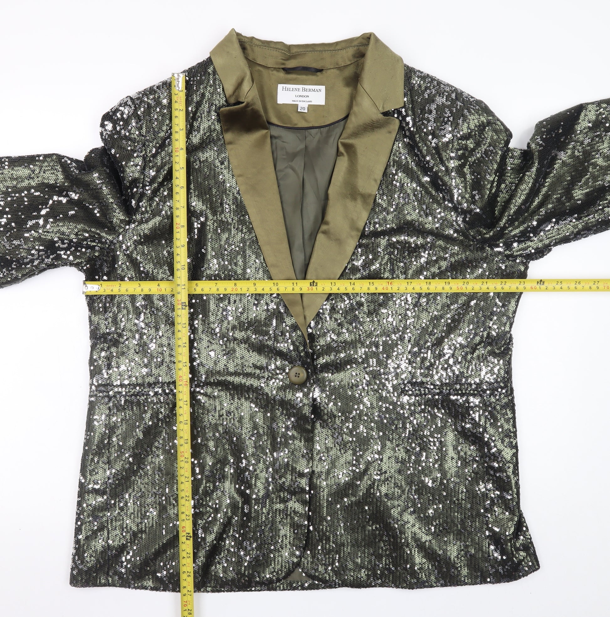 Step into sophisticated glamour with this Helene Berman London women’s sequin blazer, crafted in a striking olive-green hue. Designed in England, this beautifully tailored piece adds an elegant shimmer that transitions seamlessly from evening soirées to festive gatherings. The outer shell, made from 100% polyester, delivers a soft, structured feel with full sequin embellishment for a dazzling finish. Its mid-length cut and single-breasted front with a matching button closure enhance a refined silhouette that flatters the figure while offering plenty of comfort. Lined in smooth acetate satin, this blazer provides a luxury feel against the skin and maintains a polished drape that moves gracefully with you. Featuring long sleeves and lightly padded shoulders, it strikes an impeccable balance between contemporary chic and timeless sophistication. Perfect for special occasions, cocktail parties, or holiday events, this sequin jacket instantly elevates any outfit — pair it with tailored trousers or a sleek dress for a standout look. Ideal for the cooler autumn and winter months, it adds a touch of glamour to every wardrobe while remaining versatile enough for formal or evening outings. In excellent pre-loved condition, this Helene Berman sequin blazer has been carefully maintained, showing only minimal gentle wear and no visible flaws. Its vibrant shimmer and precise craftsmanship make it a stylish and durable choice for the fashion-forward woman who loves statement tailoring. Make a lasting impression with this luxurious, London-designed piece that embodies both quality and sophistication.
