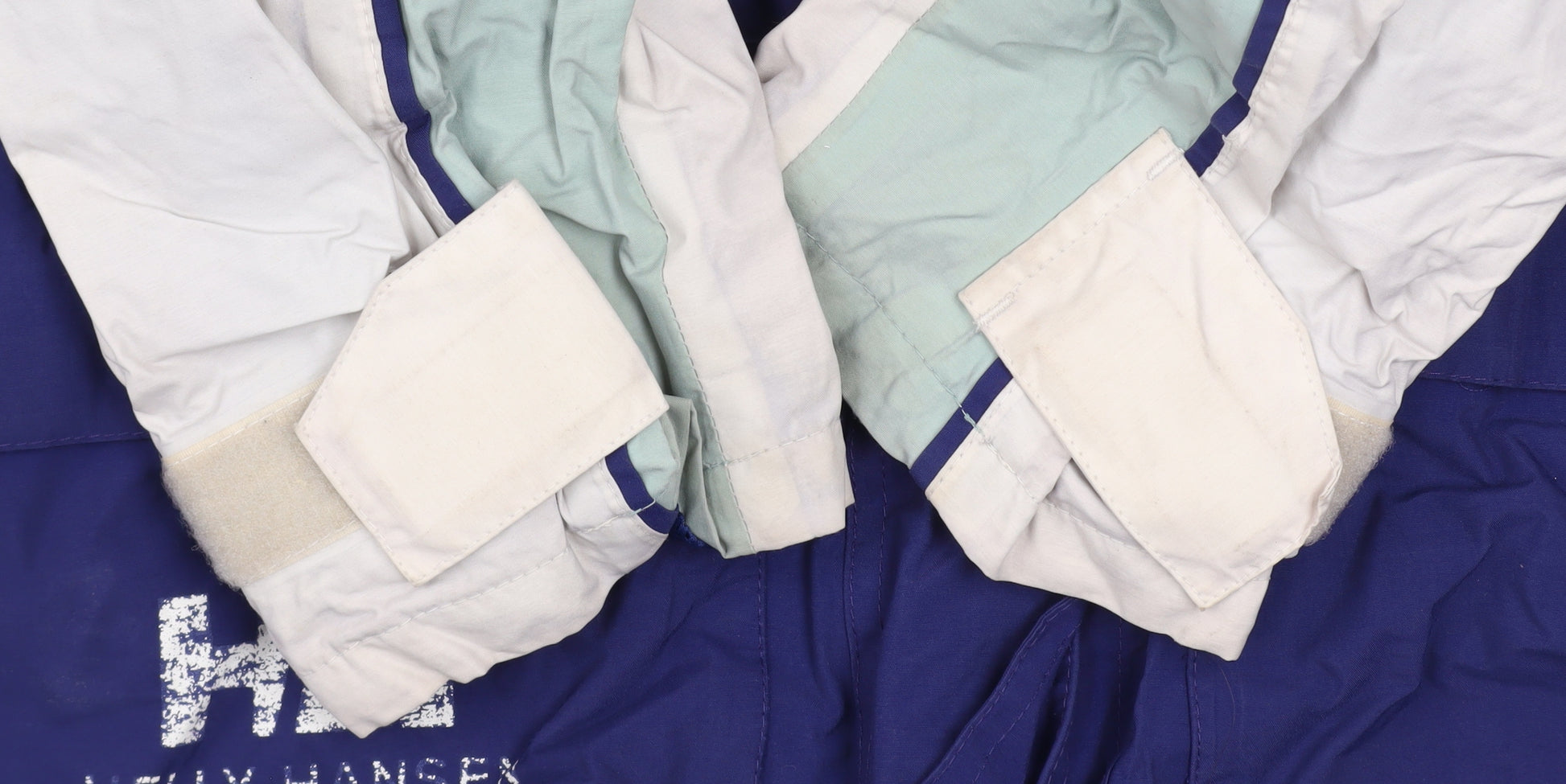 Experience trusted Norwegian craftsmanship with this Helly Hansen men's anorak-style waterproof jacket in size S. Designed for reliability in changing weather, this classic mid-length coat features a colour-block palette of rich navy blue accented by pale aqua and off-white panels, capturing a retro outdoor aesthetic that’s both stylish and practical. Constructed with a durable 100% nylon outer shell backed with polyurethane, it provides impressive protection against wind and rain while maintaining breathability and comfort for extended wear. Its fleece-lined interior offers added warmth, making it an ideal layer for autumn and winter adventures. The design includes multiple large front flap pockets for convenience, a high stand-up collar for wind protection, and an adjustable hood and cuffs secured with hook-and-loop fasteners for a personalised fit. Functional features such as full-zip closure, breathable and waterproof properties, and a reinforced hem with adjustable toggles enhance its performance practicality. This vintage Helly Hansen piece carries the brand’s iconic logo embroidery on the chest and hem, reflecting quality and authenticity. Suited for hiking, skiing, and everyday outdoor use, it provides dependable warmth and style whether on the trail or in urban settings. The jacket is in very good pre-owned condition, showing only light signs of use and slight logo fading consistent with gentle wear. Simple to maintain and machine washable, this Helly Hansen jacket remains a timeless essential for those who appreciate outdoor heritage design, durability, and Scandinavian style. Perfect for any active man who values comfort, function, and classic performance apparel.