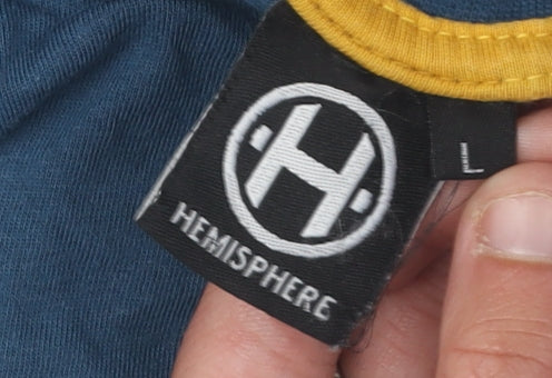 Discover the stylish Hemisphere Men's Blue Graphic T-Shirt, a perfect choice for casual outings or everyday wear. This versatile t-shirt features a classic crew neck and short sleeves, ensuring comfort and style throughout the seasons. Crafted from 100% cotton, it offers a soft and breathable feel, ideal for all-day wear. The bold graphic print design creates a trendy look that stands out, making it a must-have for any modern wardrobe. With a regular fit, it provides a relaxed yet flattering silhouette. Ideal for pairing with jeans or shorts, this t-shirt is the perfect addition to any relaxed outfit. Enjoy the lightweight jersey fabric, which is machine washable for easy care. Slightly worn with no visible damage, it's in excellent condition and ready for its next adventure. Grab this stylish piece today and elevate your casual ensemble.