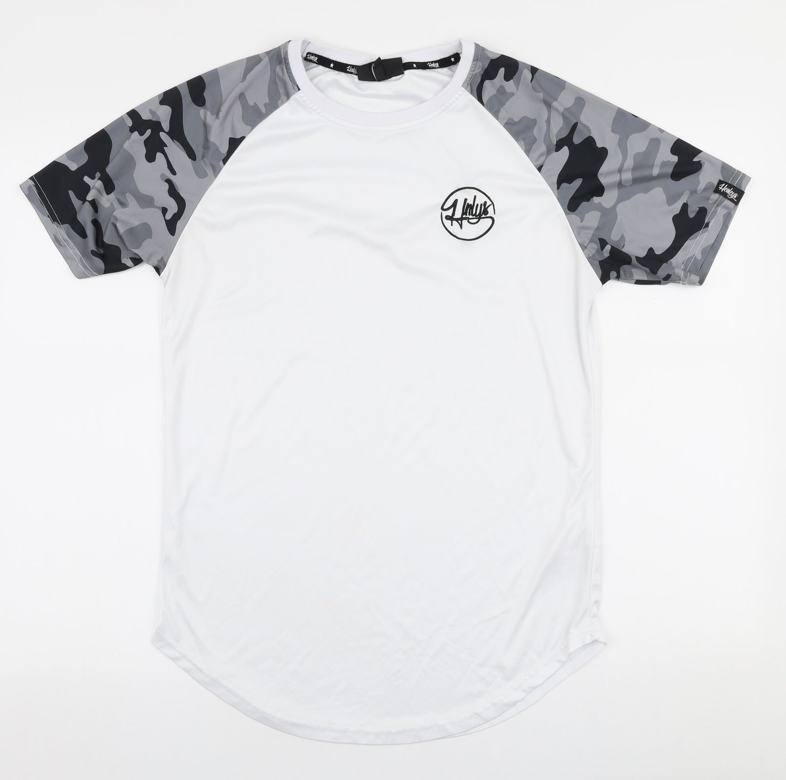Mens White Camouflage Polyester T-Shirt Size S Round Neck