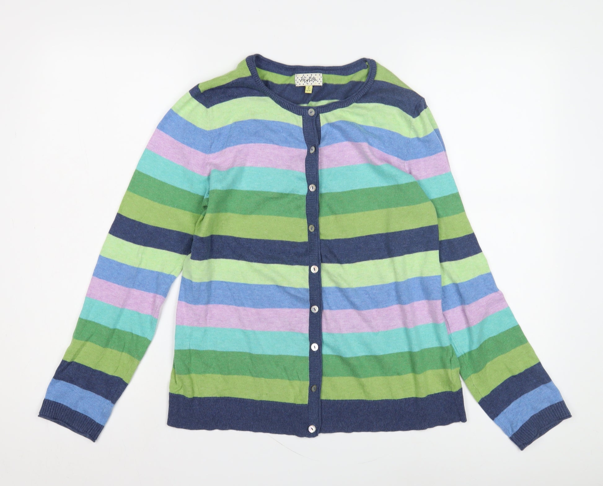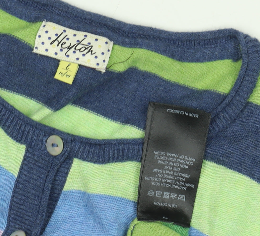Introducing the Heyton Women's Multicoloured Striped Cardigan in size L, the perfect blend of comfort and style. Crafted from 100% cotton, this cardigan ensures breathable wear all year round. Its vibrant multicoloured stripe pattern adds a fresh burst of colour to any outfit, making it ideal for casual occasions. The long sleeves and classic button accents offer a timeless appeal, while the regular fit ensures maximum comfort. Machine washable for easy care, this cardigan is a versatile addition to any wardrobe. In excellent condition, it's free from visible damage or stains, promising quality and durability. Don’t miss out on adding this chic and cosy piece to your collection!