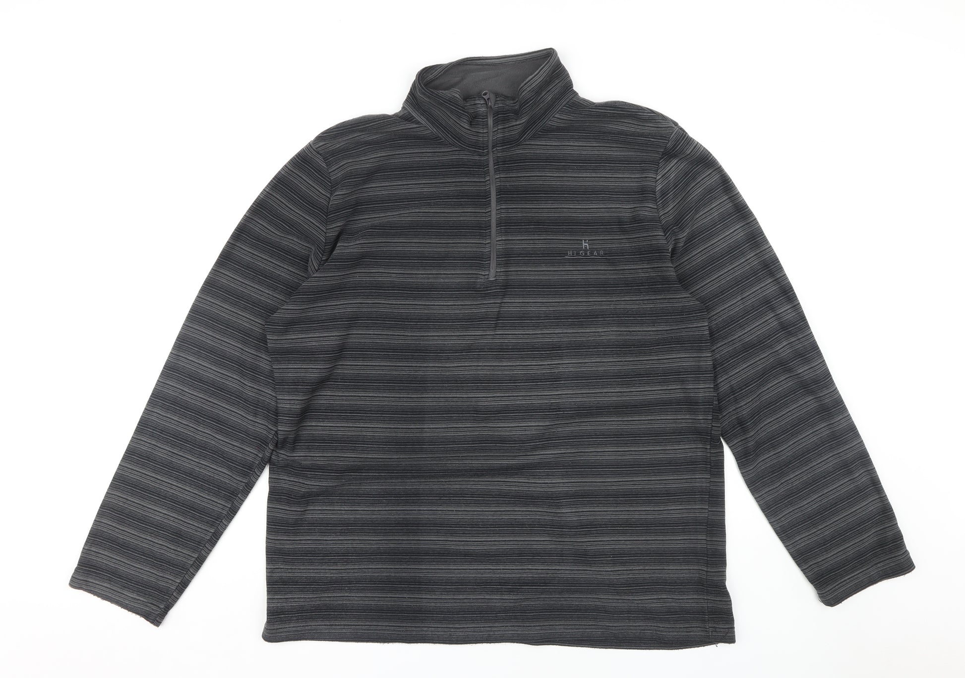 Upgrade your wardrobe with this Hi Gear Men's 1/2 Zip Sweatshirt in a versatile black shade. Perfect for autumn and winter, this 2XL fleece piece combines comfort and style with its regular fit and high neckline. The long sleeves and striped pattern add an extra layer of sophistication, making it ideal for casual outings or layering during outdoor activities. Made from soft polyester, this sweatshirt ensures warmth and durability. Don't miss out on this excellent condition item, a must-have for any fashion-forward individual.