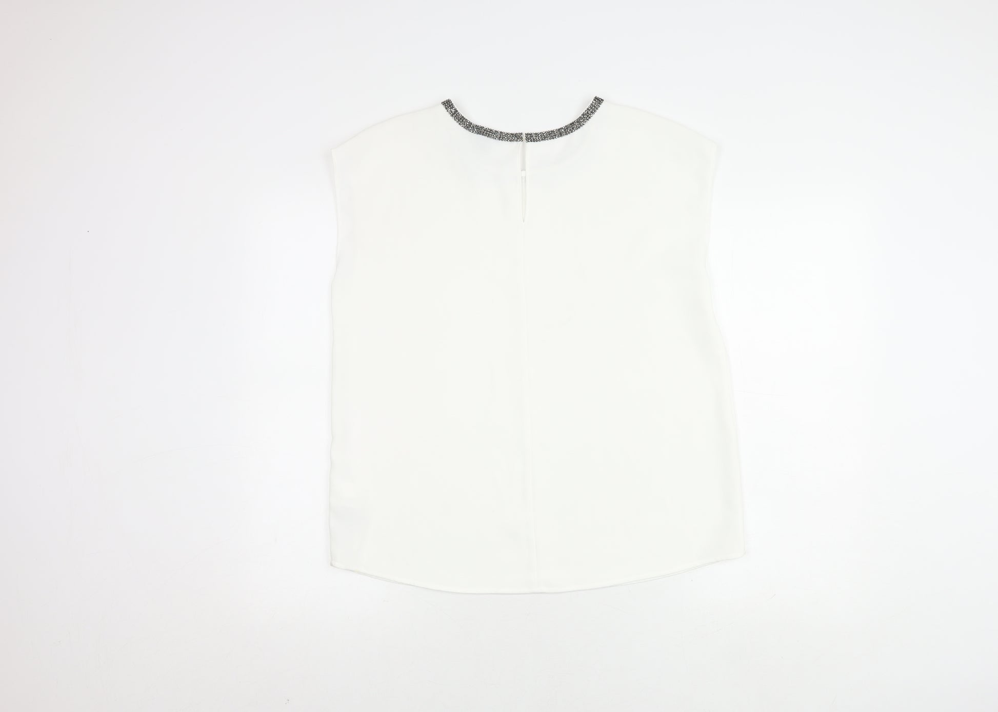 Discover elegance and simplicity with this Hilary Radley Women's Blouse in a sophisticated white color. This sleeveless blouse is designed for a classic and relaxed fit, perfect for casual outings or everyday wear. Its sleek polyester fabric offers a smooth touch and effortless style, while the metal trim accent adds a touch of flair to your outfit. Featuring a round neck and a basic camisole style, this design is perfect for layering or wearing solo during warmer weather. Its solid white pattern is versatile, offering endless styling possibilities with skirts, trousers, or jeans. Carefully crafted for all seasons, this piece ensures comfort and chic style. The cap sleeves bring a hint of detail, maintaining simplicity while enhancing the blouse’s structure. With a pull-on closure and lined material, it offers an easy yet polished look. The blouse is hand washable, ensuring practicality with low maintenance. In excellent condition with no signs of visible wear, this blouse is a smart addition to any wardrobe offering timeless charm without compromising on quality or style. Priced at just £15.00, it's a bargain to indulge in for premium comfort and fashion.