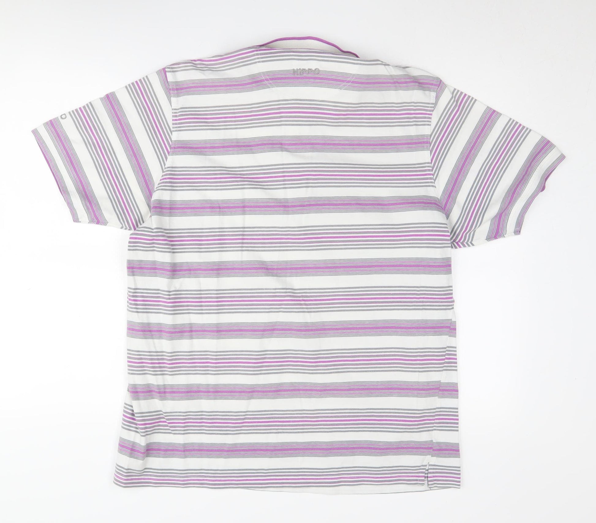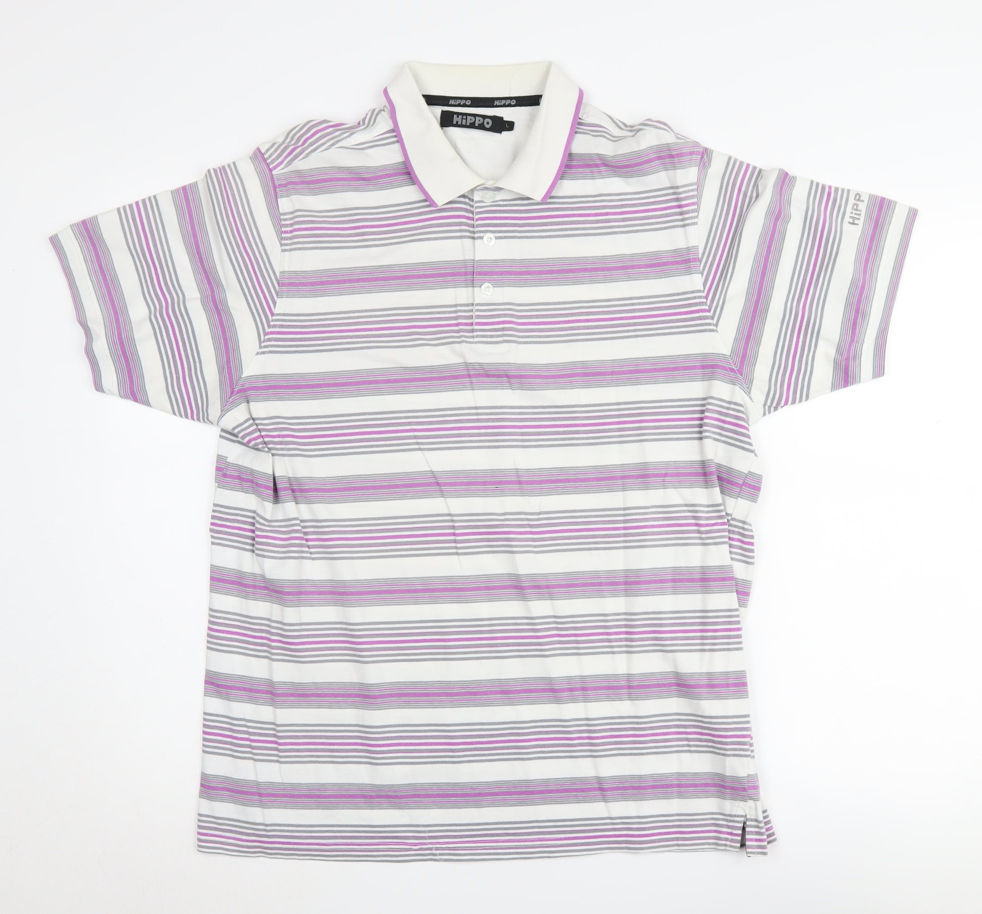 Step out in style with this classic Hippo Men's Polo Shirt, perfect for casual occasions this summer. Crafted from 100% cotton, this lightweight and breathable polo shirt ensures comfort all day long. Featuring an eye-catching purple striped pattern, it offers a trendy yet timeless look. The collared neckline and short sleeves provide a traditional polo appeal, making it a versatile addition to any wardrobe. Ideal for warm summer days, this casual polo shirt can easily transition from a daytime outing to a relaxed evening gathering. Pair it with jeans or shorts for a laid-back yet polished look. Designed with a point collar style and button closure, it offers a neat and refined finish. This polo shirt includes a stylish logo accent, adding a touch of brand signature. Machine washable for easy care, it is a practical choice for everyday wear, combining fashion with function. Upgrade your wardrobe with this excellent condition polo shirt and enjoy its comfort and style. Don't miss out on adding this must-have piece to your collection for just £12.50.