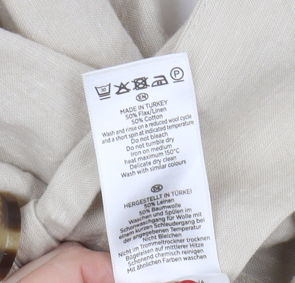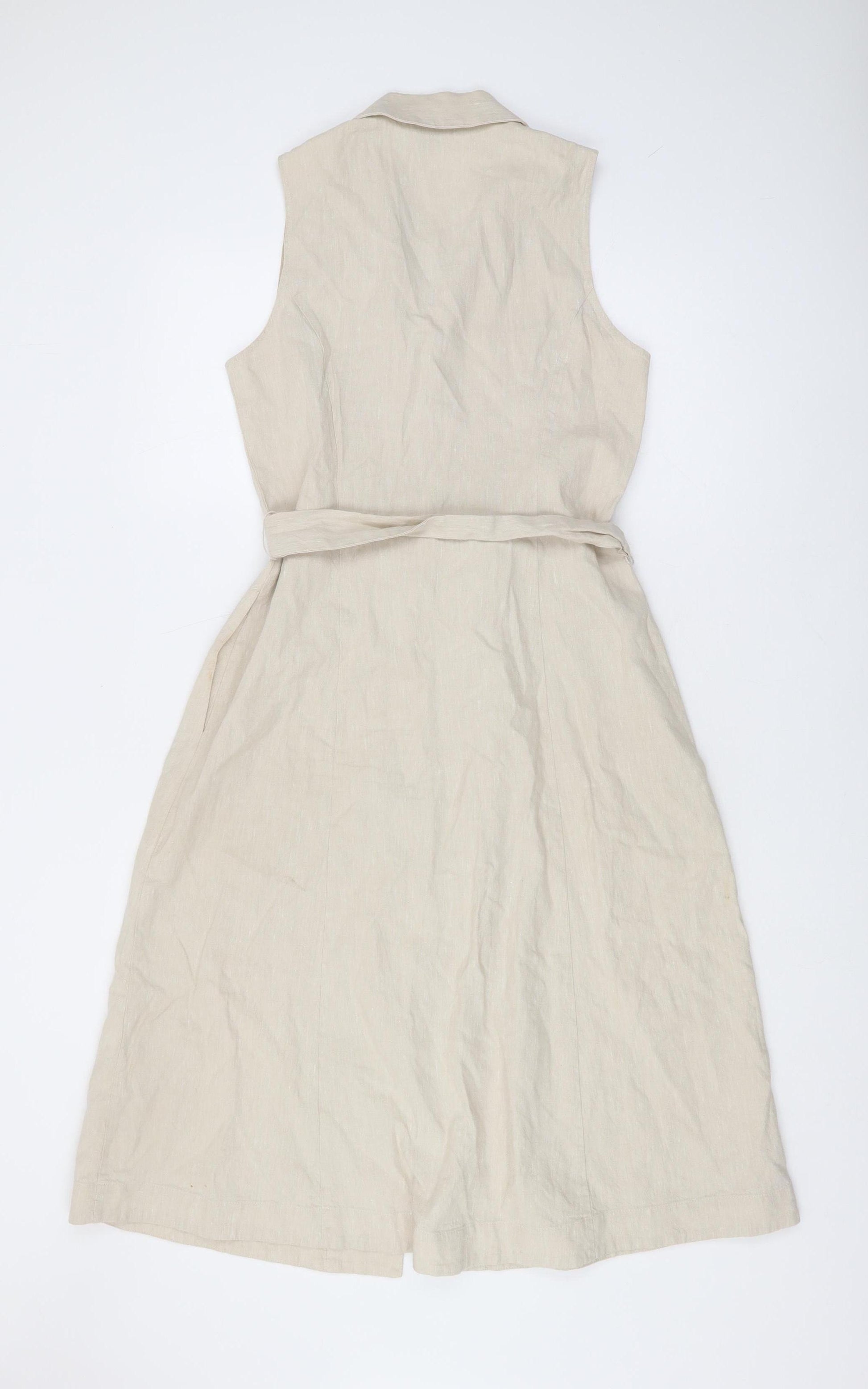Elevate your wardrobe with this elegant beige dress from Hobbs, tailored for women who appreciate timeless style. Crafted thoughtfully from a blend of 50% linen and 50% cotton, this dress promises both comfort and breathability — perfect for warmer days or evenings. The sleeveless design is ideal for showcasing your choice of accessories or layering with a light jacket. With a smart collared neckline, the dress can seamlessly transition from casual outings to more refined occasions.The dress features a button closure running down the front, adding a functional yet stylish accent, and a flattering belted waist that accentuates your figure and provides a personalized fit. The woven fabric has a subtle texture that contributes to its sophisticated appeal, and the lightweight nature ensures ease of movement. This piece is finished with a knee-length cut, combining practical wearability with a chic look, suitable for a variety of settings. No visible patterns disrupt the dress’s sleek, minimalist design, making it a versatile addition to any wardrobe. Whether paired with flats for a day out or styled with heels for an evening affair, it's a dependable choice for multiple occasions.This gently used dress is in excellent condition, with only minor creasing that won't detract from its overall charm. Make this Hobbs dress a staple in your fashion collection for a look that speaks of elegance and effortless style. Grab this wardrobe must-have for a great price today!