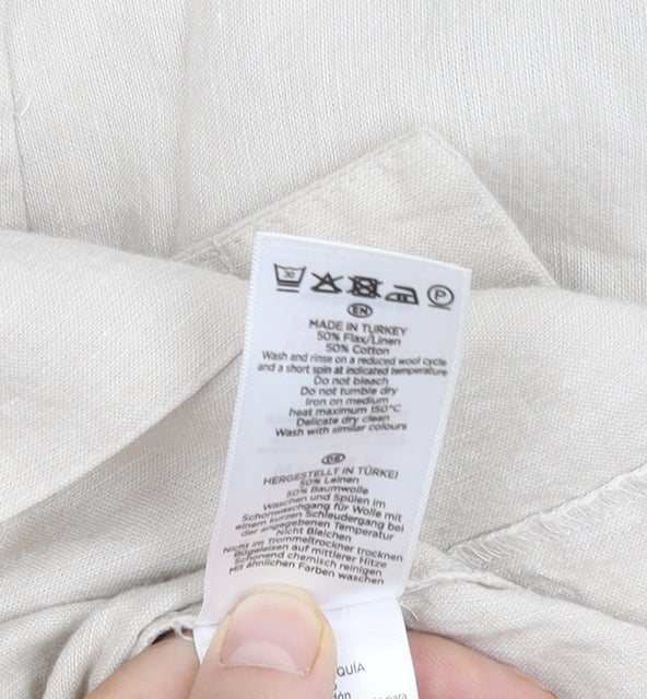 Discover the elegance of the Hobbs beige dress, exquisitely crafted for the discerning woman. With its woven fabric made from an ideal blend of linen and cotton, this dress offers both comfort and style for sunny summer days. The dress comes in UK size 10 and features a sleeveless design that facilitates easy movement while maintaining a sophisticated look. Its collared neckline is complementarily detailed with buttons, offering a refined yet classic appearance.Enhanced with a strappy sleeve type, this dress pleasantly contours to your shape, while the belt accents your waist, adding a flattering silhouette. The natural beige colour keeps the outfit neutral, making it easy to accessorize for different occasions, whether you're headed out for a casual day in the city or a relaxing beach outing.With no elaborate patterns, this piece emphasizes a minimalist elegance, perfect for those looking to embody effortless style. Despite light marks and slight creases, its overall condition remains very good, suitable for someone looking for affordable luxury. Its woven texture promises durability and a tactile sensory experience, ensuring you not only feel empowered wearing it but also revel in its comfort.Complete your wardrobe with this versatile piece that makes transitioning from day to evening seamless. Designed for summer wear, the Hobbs beige dress is a staple for any fashion-forward individual. Secure your piece of refined wardrobe elegance today, and let this garment elevate your style to new heights.