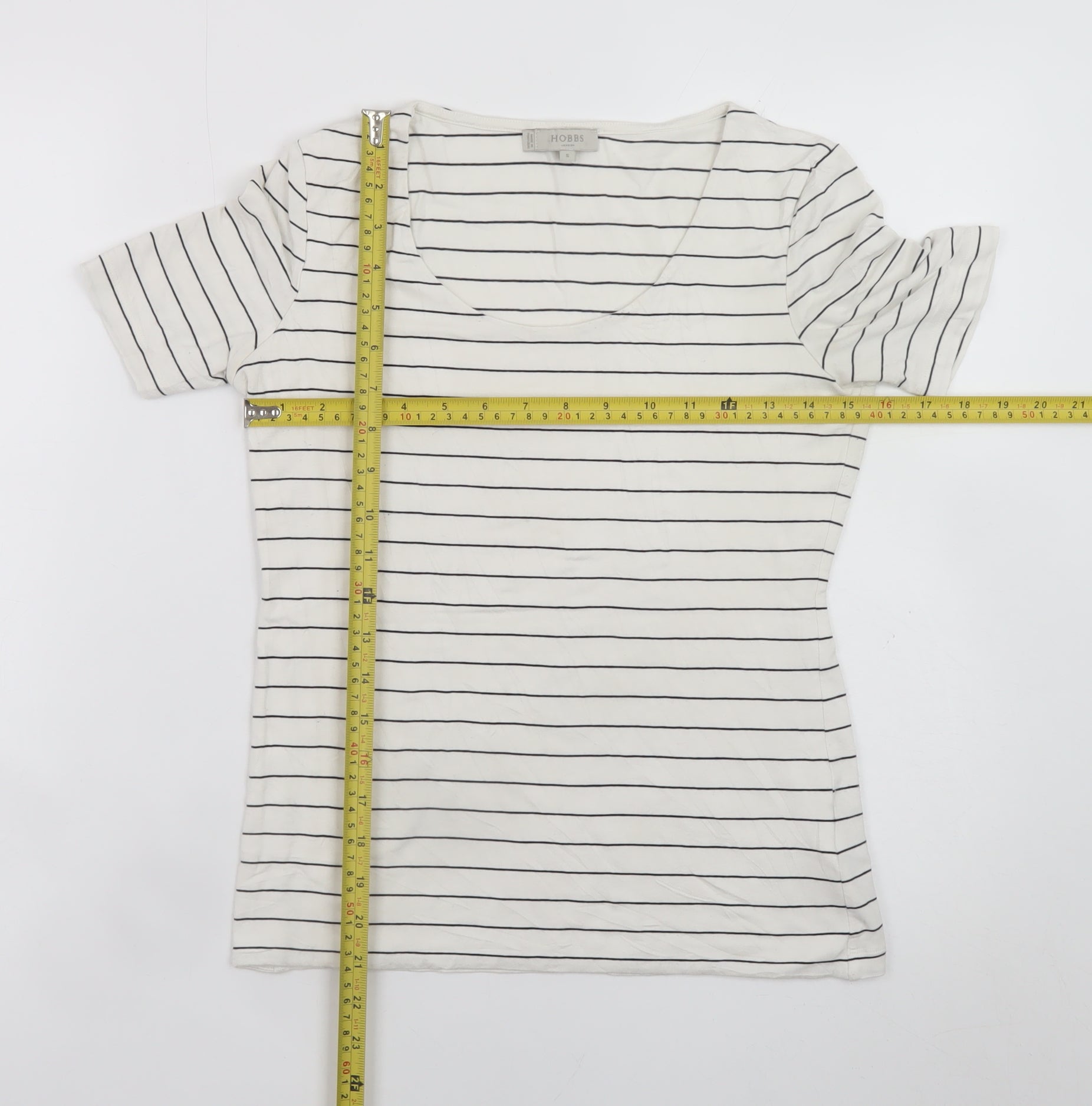 This elegant Hobbs women’s striped T-shirt delivers effortless everyday style with a touch of sophistication. Crafted in Portugal from a soft, lightweight jersey blend of viscose and elastane, the fabric provides a smooth feel and just the right amount of stretch for comfort and easy wear. In a classic white base with thin navy stripes, this short-sleeved top is a versatile wardrobe essential that transitions seamlessly through the seasons. Designed with a flattering scoop neckline and a regular fit, it complements jeans, chinos, or skirts for casual days and layered looks alike. The minimalist design makes it both timeless and easy to style, while the high-quality construction reflects Hobbs’ reputation for refined modern fashion. The T-shirt’s breathable, stretch fabric and refined silhouette ensure comfort whether you’re at work, travelling, or relaxing at home. Ideal for spring and summer wear, it’s an easy-care, machine-washable piece that remains stylish and comfortable over time. The simple pullover closure, short sleeves, and stripe pattern channel a polished yet relaxed aesthetic that stands out for its understated charm. In excellent pre-loved condition with no visible damage, this Hobbs T-shirt offers great value and enduring quality. Perfect for anyone seeking a dependable and chic everyday staple, it showcases a balance of comfort and sophistication that makes it a must-have addition to any modern wardrobe. Pair it with your favourite denim and trainers for a casual weekend look or tuck it into tailored trousers for a smart-casual finish. A versatile piece that embodies timeless simplicity, this Hobbs striped tee captures the essence of laid-back luxury in classic British style.